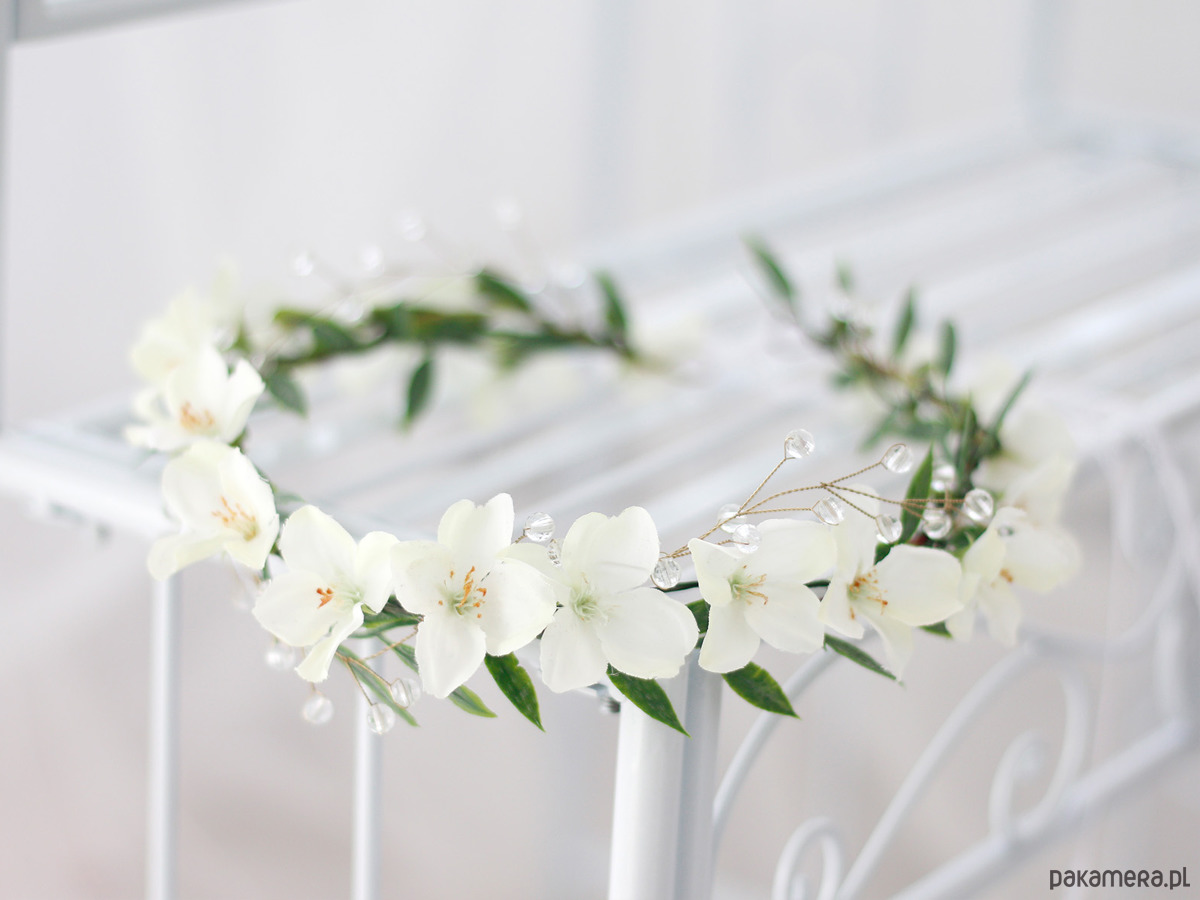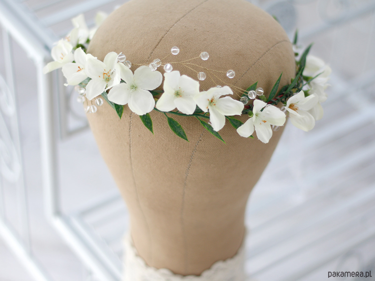 Romantyczny wianek na głowę, zdobiony kwiatami z tkaniny, syntetycznymi listkami i transparentnymi koralikami. Możliwość regulacji wielkości obwodu, dzięki koronkowej tasiemce z tyłu. Będzie pasował zarówno na głowę dziecka, jak i osoby dorosłej. Ozdoba będzie idealna na Pierwszą Komunię Świętą. Wianek wykonany ręcznie, z najwyższą starannością, w pracowni "Lola White" w Polsce.