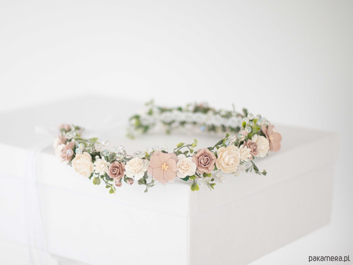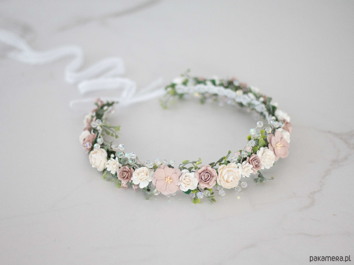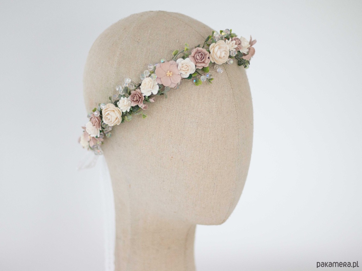 Romantyczny, kwiatowy wianek na głowę. Wianek wykonany jest z ręcznie formowanych i barwionych papierowych kwiatów oraz syntetycznych listków. Możliwość regulacji wielkości obwodu, dzięki koronkowej tasiemce z tyłu. Wianek będzie doskonałym uzupełnieniem stroju komunijnego. Ozdoba wykonana ręcznie, z najwyższą starannością, w pracowni "Lola White" w Polsce.