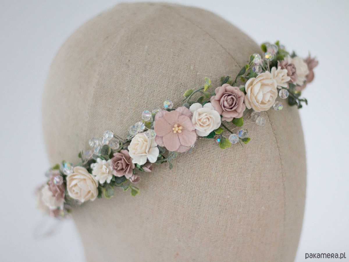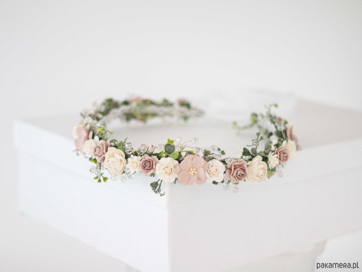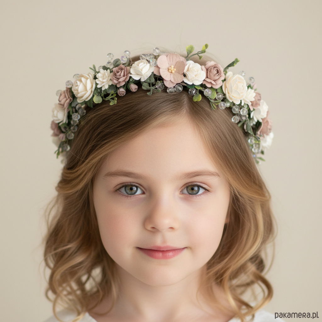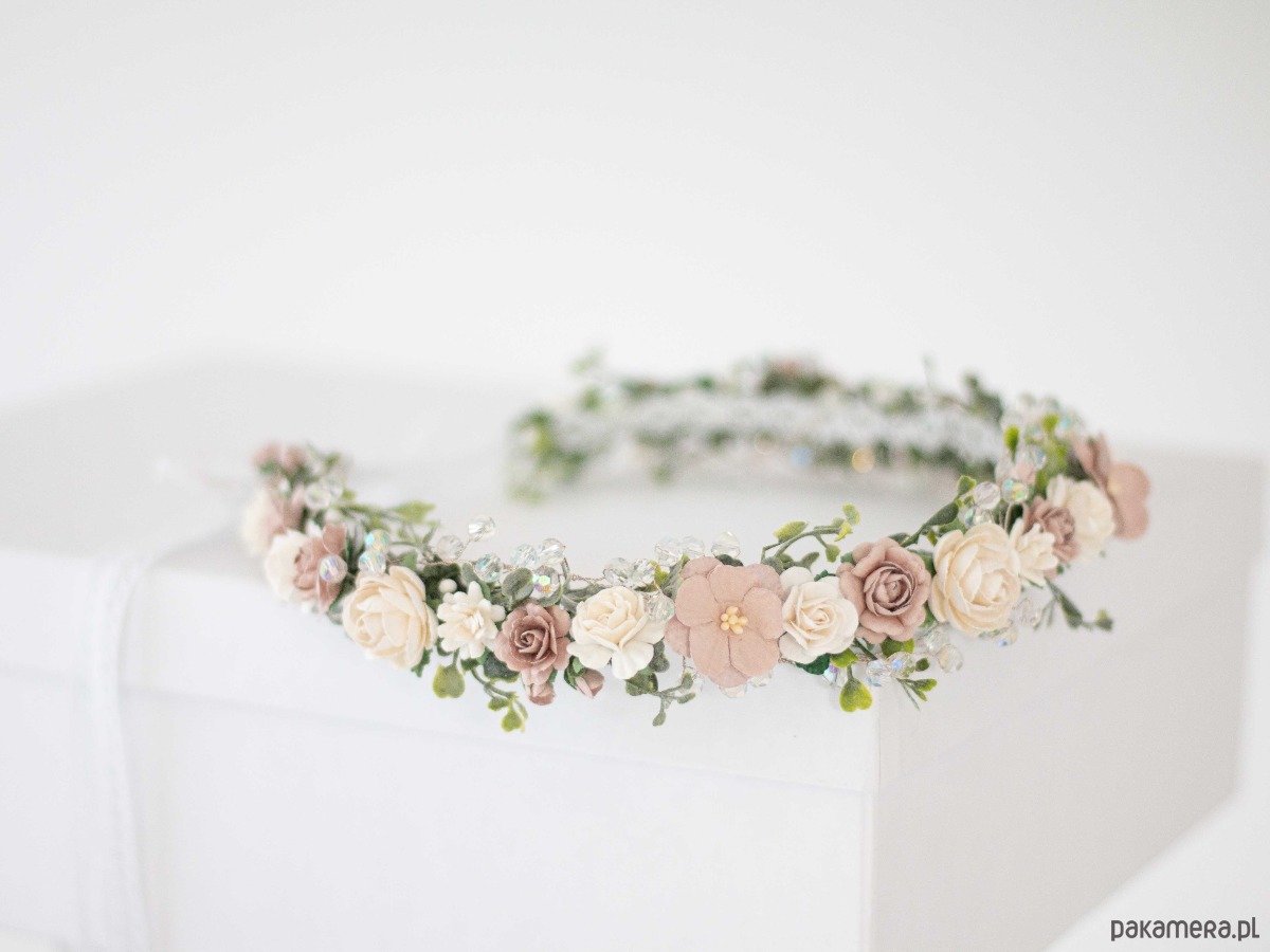 Romantyczny, kwiatowy wianek na głowę. Wianek wykonany jest z ręcznie formowanych i barwionych papierowych kwiatów oraz syntetycznych listków. Możliwość regulacji wielkości obwodu, dzięki koronkowej tasiemce z tyłu. Wianek będzie doskonałym uzupełnieniem stroju komunijnego. Ozdoba wykonana ręcznie, z najwyższą starannością, w pracowni "Lola White" w Polsce.