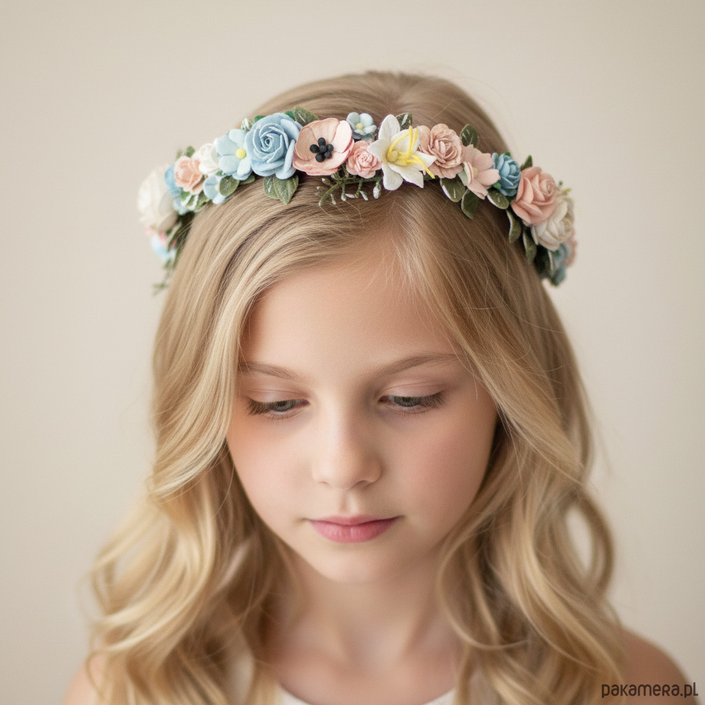Romantyczny wianek na głowę, zdobiony papierowymi kwiatami i syntetycznymi listkami. Starannie dobrane kształty kwiatów w odcieniu złamanej bieli. Możliwość regulacji wielkości obwodu, dzięki koronkowej tasiemce z tyłu. Będzie pasował zarówno na głowę dziecka, jak i osoby dorosłej. Ozdoba będzie idealna na Pierwszą Komunię Świętą. Wianek wykonany ręcznie, z najwyższą starannością, w pracowni "Lola White" w Polsce.