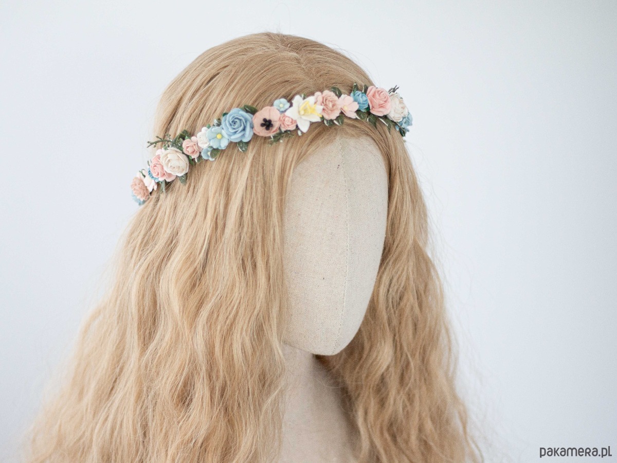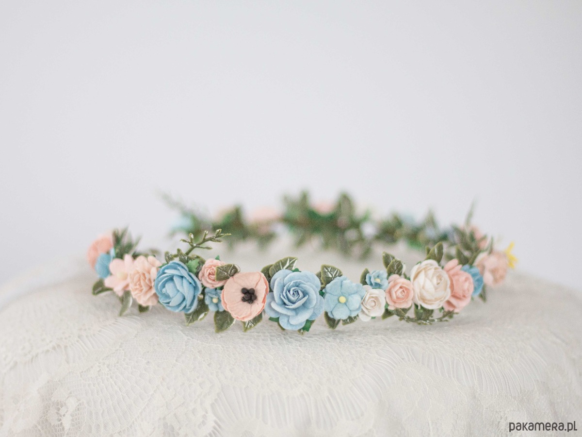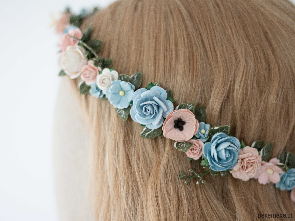 Delikatny wianek na głowę róż i błękit