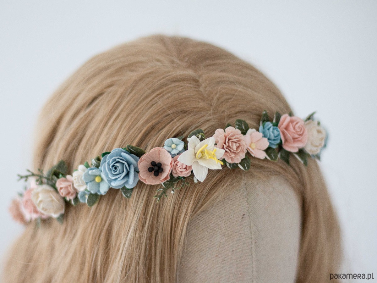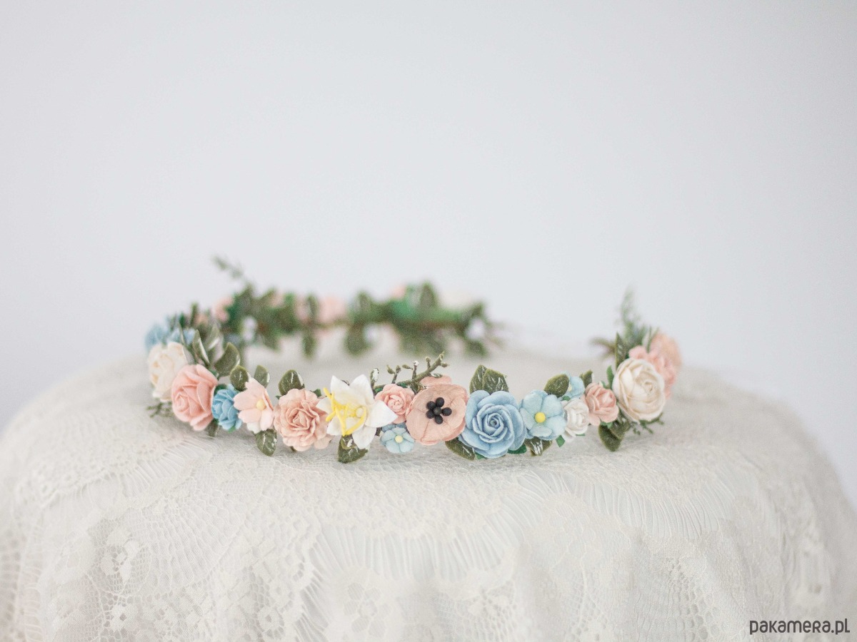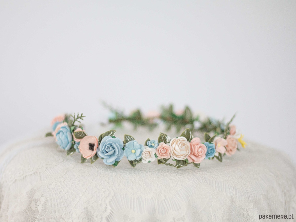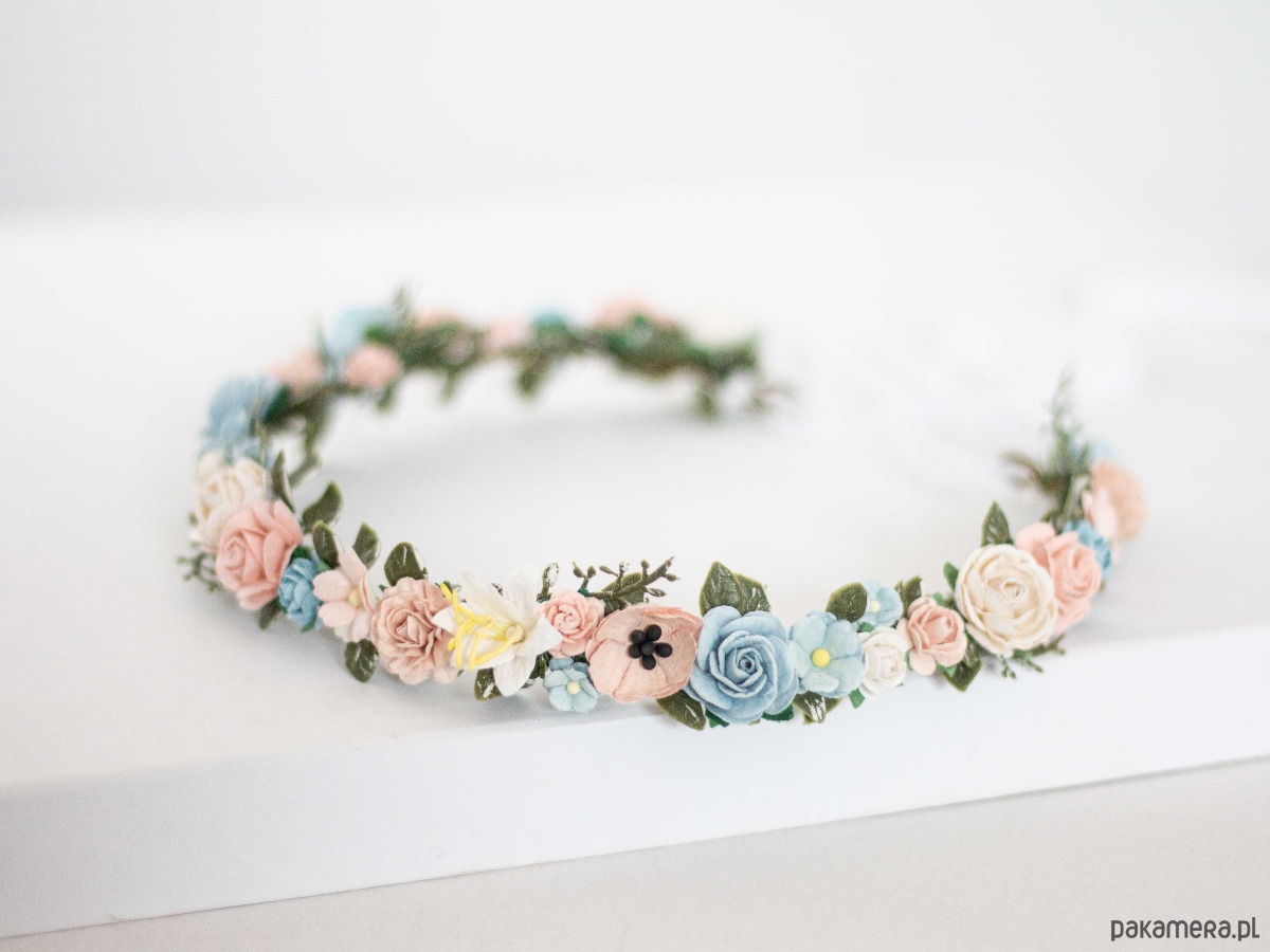 Delikatny wianek na głowę róż i błękit
