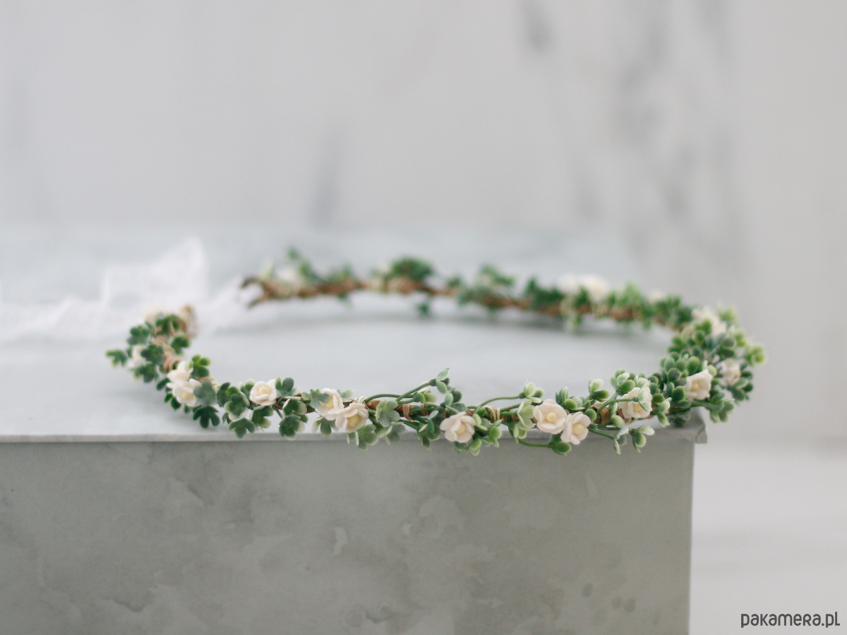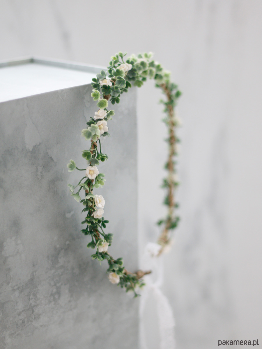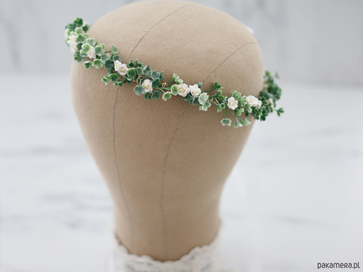 Piękny wianek na głowę, utrzymany w tonacji zieleni i bieli. Wykonany z materiałów syntetycznych dzięki czemu jest trwały i posłuży przez wiele lat. Część kwiatowa wianka ma 50cm, więc pasuje na każdą głowę o obwodzie powyżej 50cm. Będzie pasował zarówno na głowę dziecka, jak i osoby dorosłej. Możliwość regulacji wielkości obwodu, dzięki koronkowej tasiemce z tyłu.