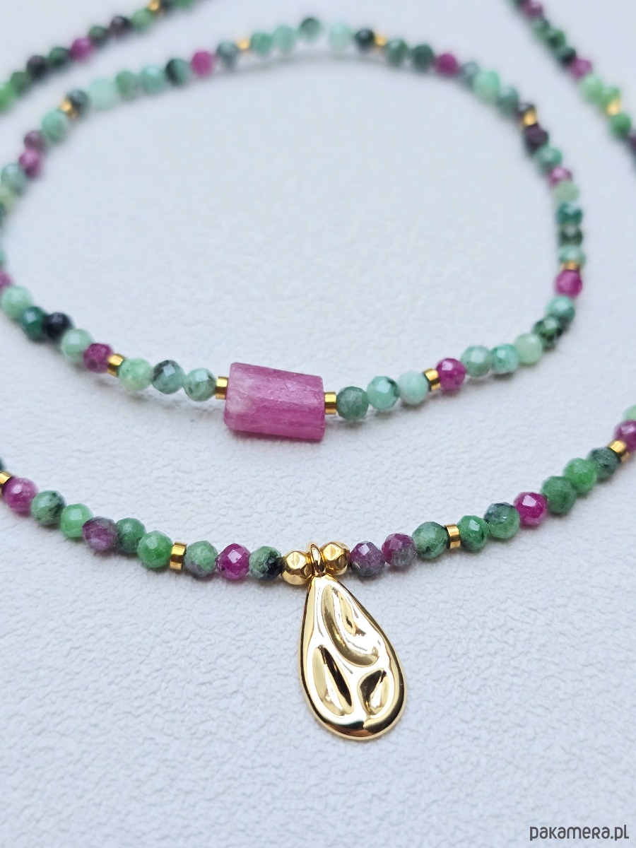 Piękny komplet z kamieni zoisytu i rubinu z przekladkami ze złoconego hematytu.