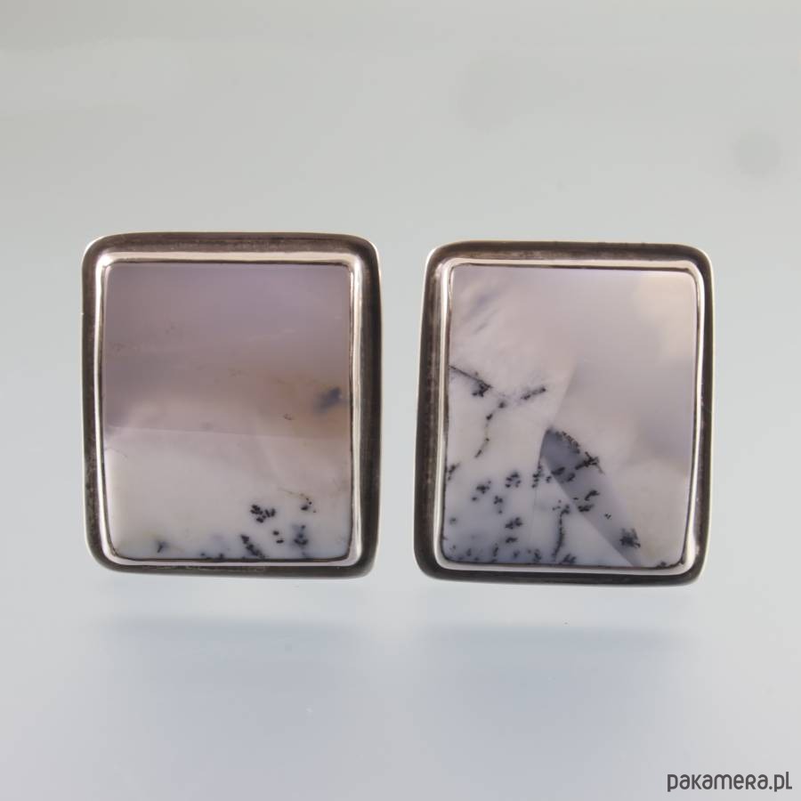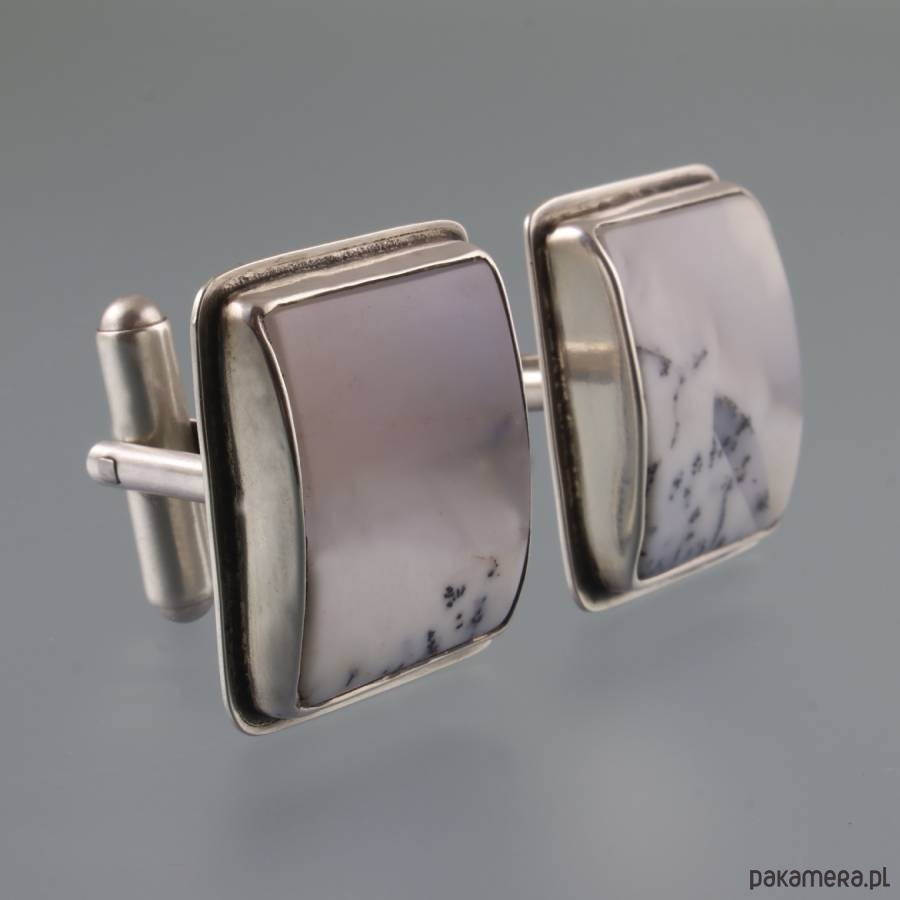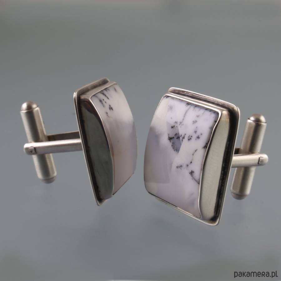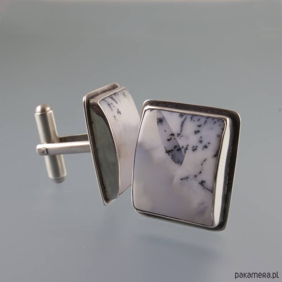 Ręcznie wykonane srebrne spinki do mankietów z agatem dendrytowym. Srebro próby 925 - próba wybita na spodzie. Wymiary spinek: 2,25 cm x 2,0 cm. Waga spinek: 15,5 g.