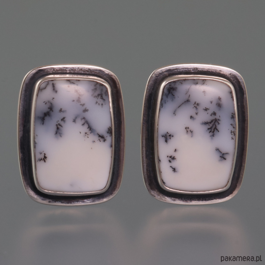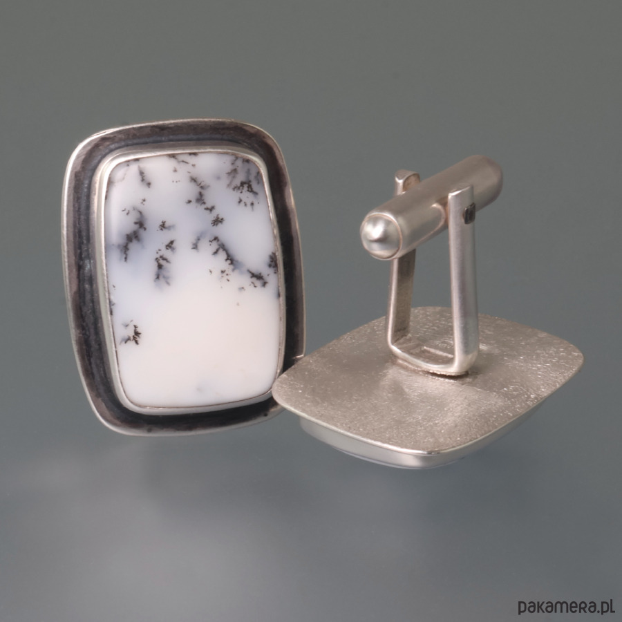 Ręcznie wykonane srebrne spinki do mankietów z agatem dendrytowym. Srebro próby 925 - próba wybita na spodzie. Wymiary spinek: 1,8 cm x 2,5 cm. Waga spinek: 13,3 g.