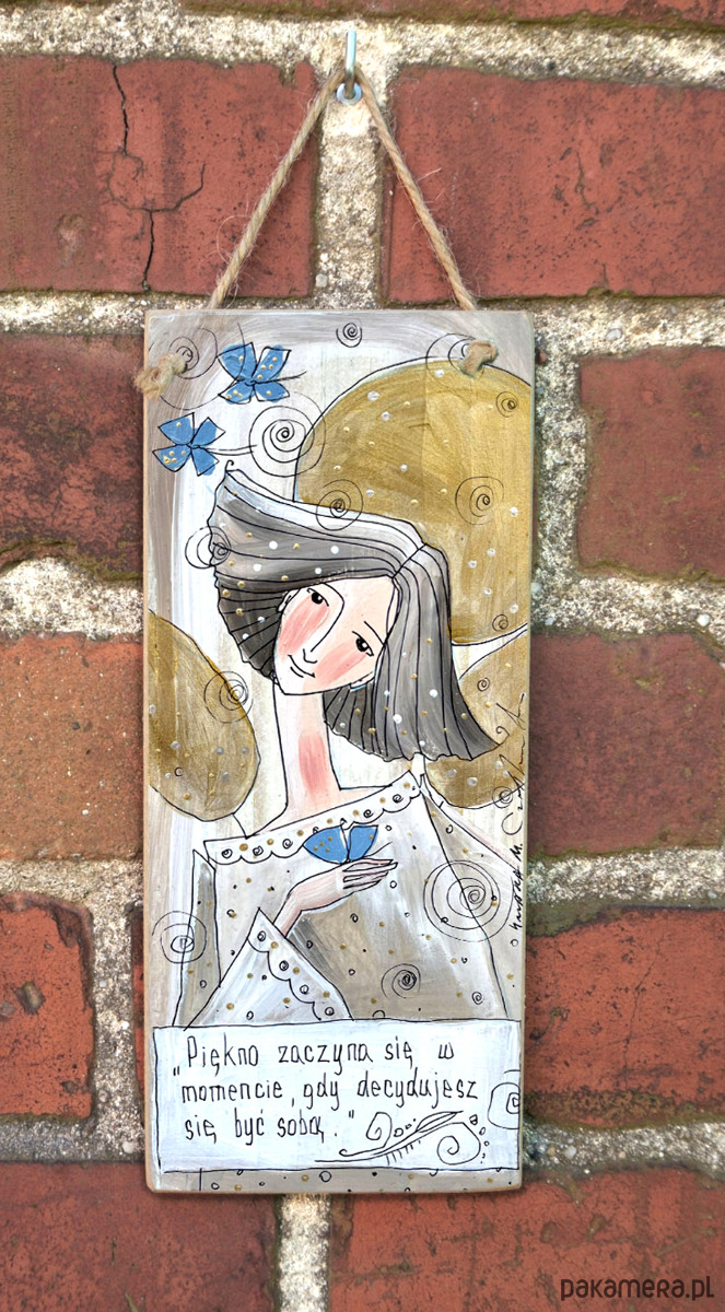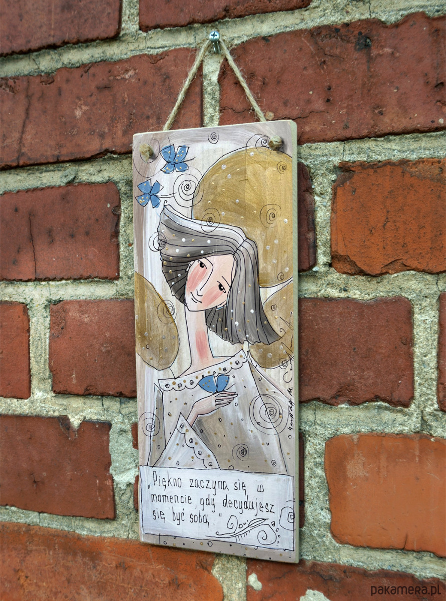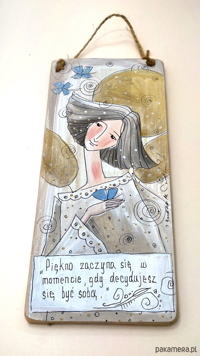Reprodukcja autorskiej pracy, umieszczona na płycie MDF o grubości 6 mm, z zawieszką w postaci ekologicznego sznurka.