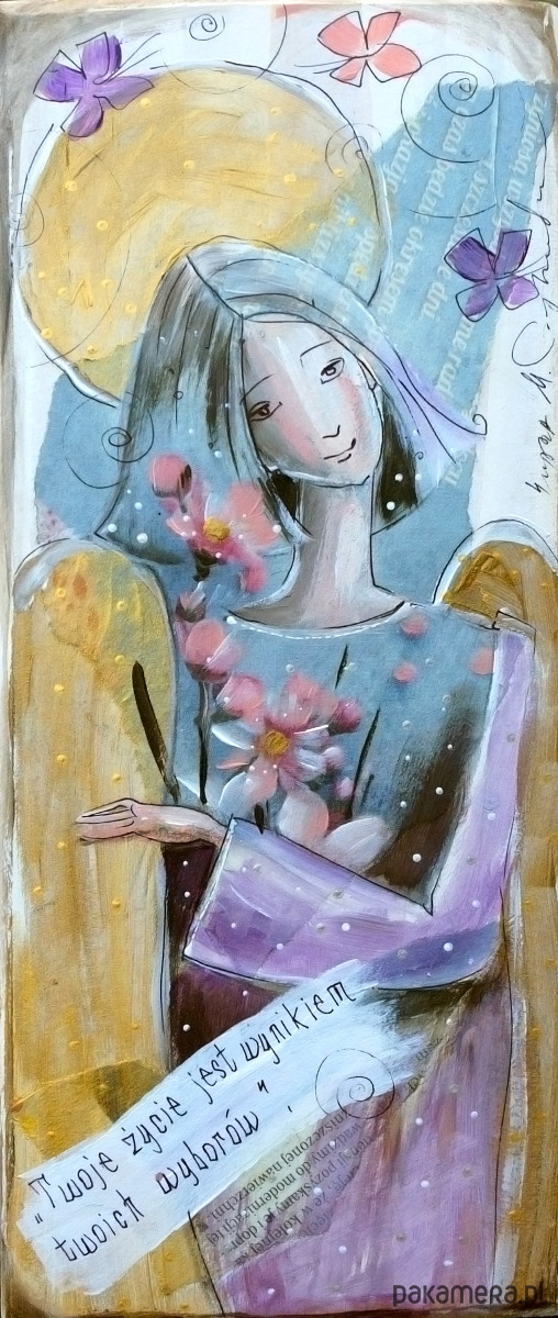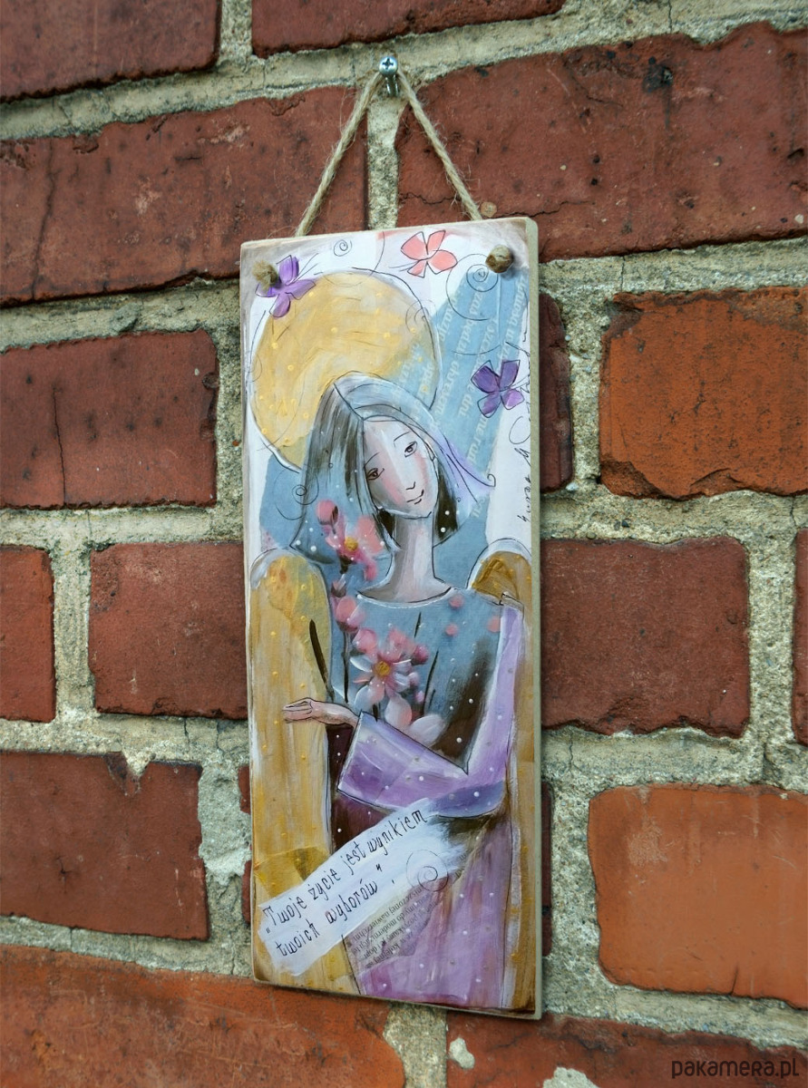 Reprodukcja autorskiej pracy, umieszczona na płycie MDF o grubości 6 mm, z zawieszką w postaci ekologicznego sznurka.