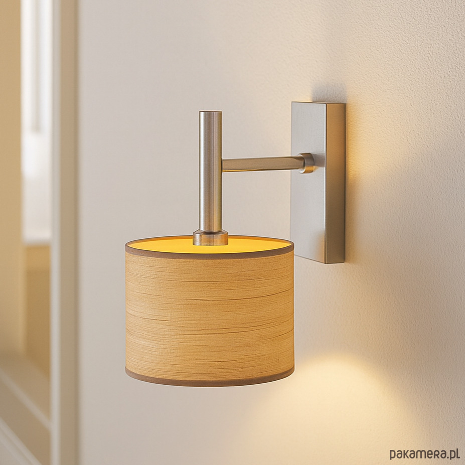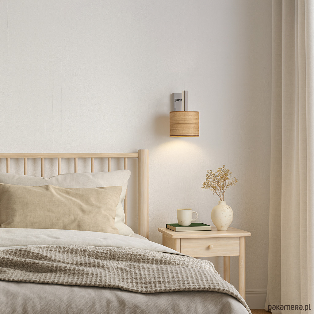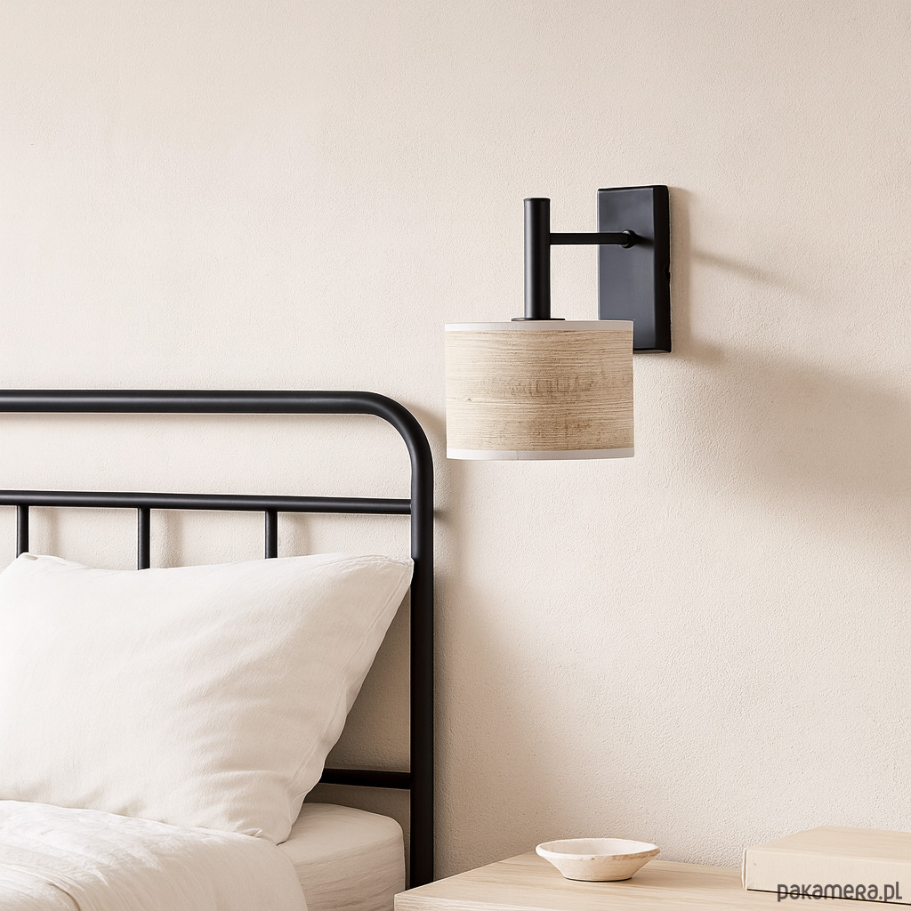Kinkiet ścienny AKRA ECO z pewnością spełni Twoje oczekiwania, jeżeli szukasz funkcjonalnego i eleganckiego oświetlenia do sypialni czy salonu. Smukły stelaż lampy i cylindryczny abażur skierowany ku dolnej powierzchni zachwyca prostotą i szykiem. Światło wydobywa się w górę i dół, podświetlając abażur, rzucając przyjemny blask na otoczenie wokół. Rozproszone światło na powierzchni abażura eksponuje drewniany wzór wytłaczany na jego powierzchni wprowadzając do wnętrza przytulny nastrój.