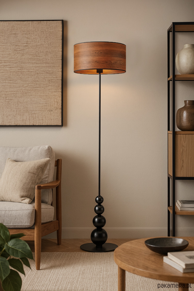 Lampa podłogowa ROMA ECO z najnowszej kolekcji polskiego producenta lamp i abażurów LYSNE.PL to model dla miłośników prostych acz funkcjonalnych rozwiązań. Wzrok przykuwa stelaż lampy, który zdobią 4 kule odpowiednio ustawione od największej do najmniejszej. Nietuzinkową podstawę lampy wieńczy cylindryczny abażur o średnicy 40 cm. Stojąca lampa podłogowa ROMA ECO to wytworne i eleganckie oświetlenie, które nada charakteru zarówno wnętrzom domowym jak i komercyjnym. Świetnie współgrać będzie z nowoczesną aranżacją sypialni, stylowym salonem urządzonym z zgodnie z duchem stylu industrialnego czy przytulnym pokojem dziecięcym z elementami koncepcji hygge. Lampa podłogowa ROMA ECO rozpromieni całe wnętrze przytulnym, miłym dla oka blaskiem.