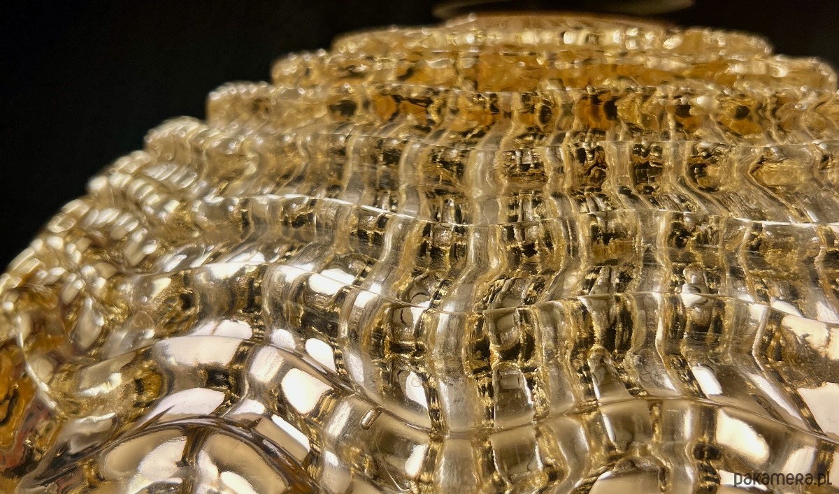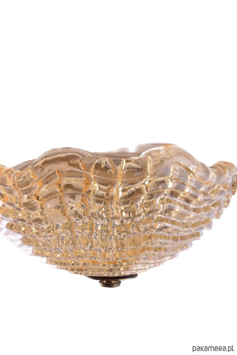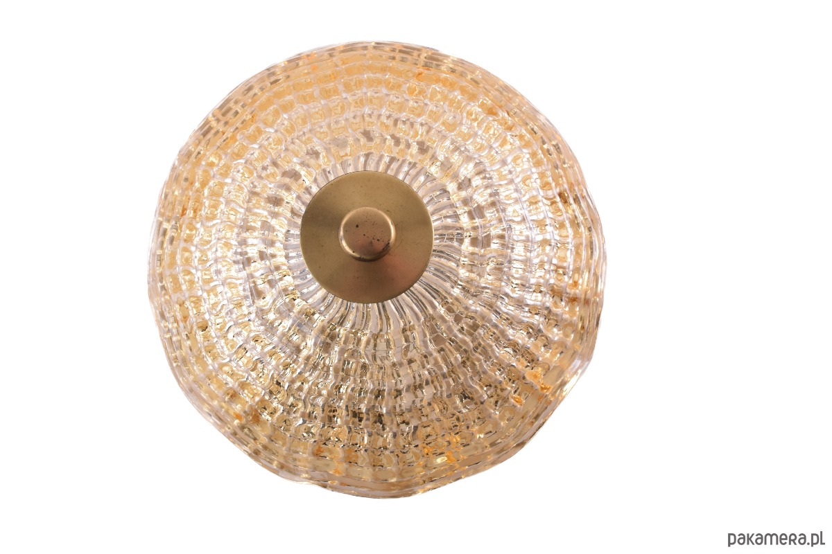 Elegancka plafoniera wykonana z grubego, dekoracyjnie formowanego szkła w ciepłym, bursztynowo-złotym odcieniu. Szkło posiada wyraźną, reliefową strukturę, która spektakularnie rozprasza światło, tworząc efekt miękkiej, nastrojowej iluminacji.