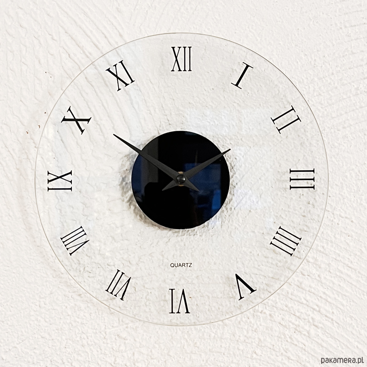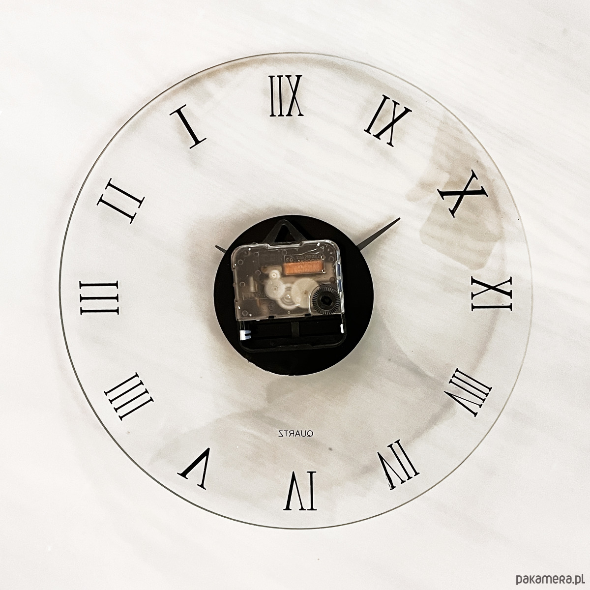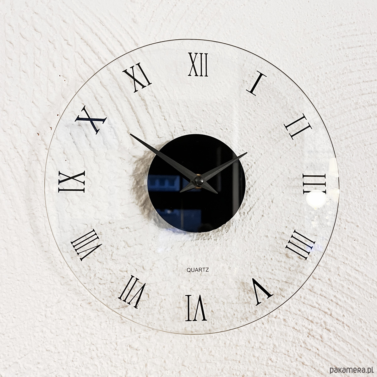 Niemiecki designerski zegar ścienny w stylu postmodernistycznym z lat 90. Tarcza wykonana jest z przeźroczystego szkła, proste wskazówki stalowe w czarnym kolorze, cyfry na cyferblacie rzymskie. Zegar zaprojektowany w Niemczech, mechanizm niemiecki. Zegar wyposażony jest w mechanizm kwarcowy, zasilany jedną baterią typu AA. Zegar w stanie bardzo dobrym, bez uszkodzeń.