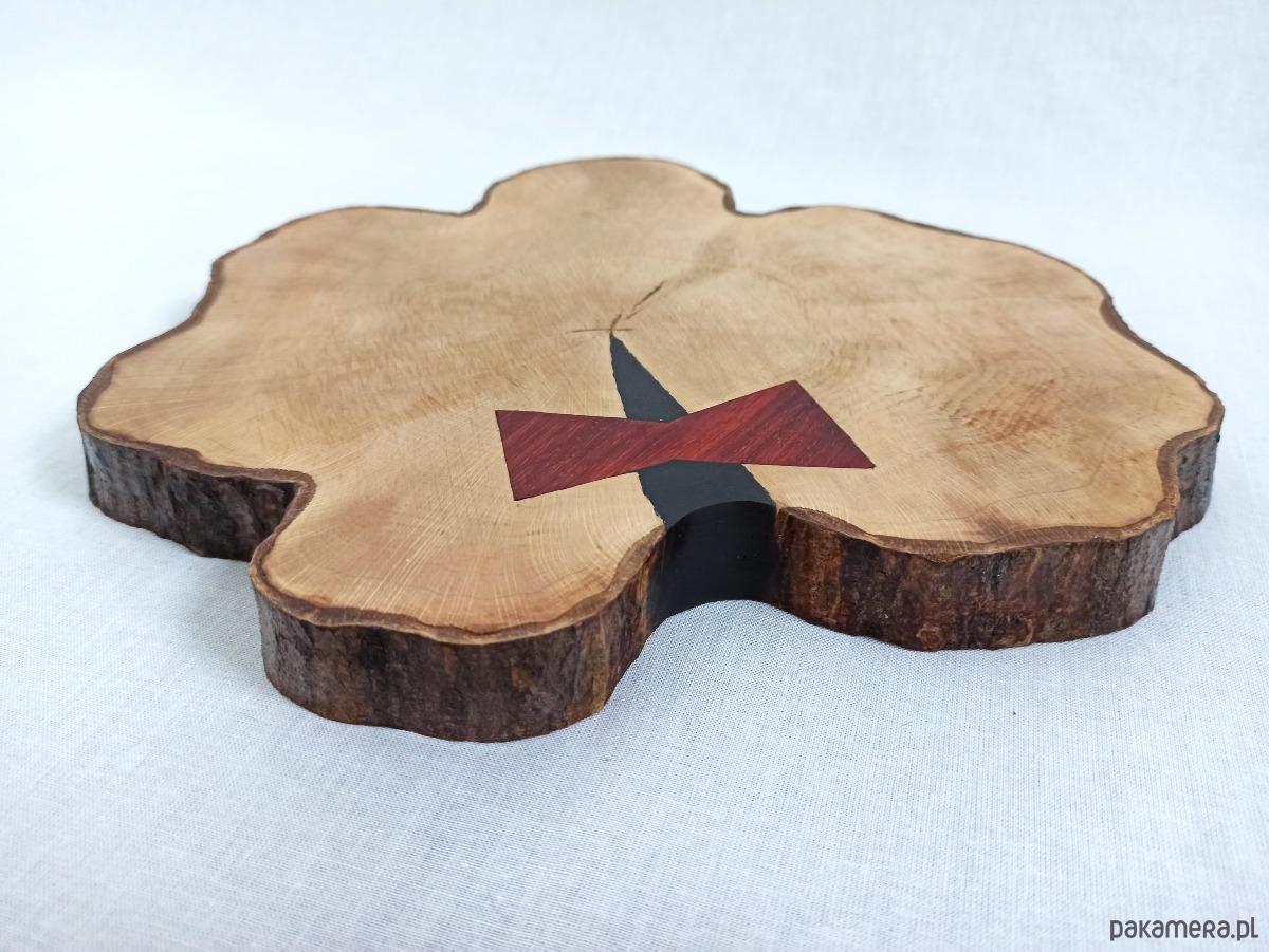Deska do serwowania z kokardką z plastra drewna grabu. Deska ma nieregularny piękny kształt z wstawioną kokardką z drewna egzotycznego padouk. Doskonale nadaje się do podawania przekąsek, serów, mięs i deserów. Idealna jako pdstawka pod gorące dania i piękna dekoracja stołu. Drewno grabu, z którego została wykonana jest bardzo twardym drewnem odpornym na zniszczenia i zarysowania. Wykończona jest najlepszymi olejami do drewna odpornymi na temperaturę i umożliwiającymi kontakt z żywnością.