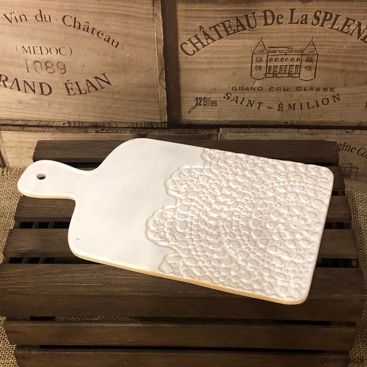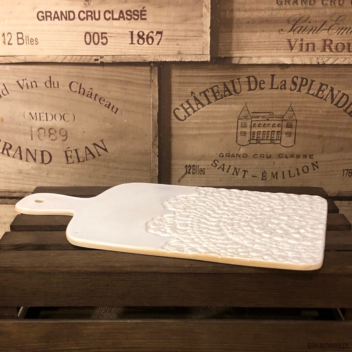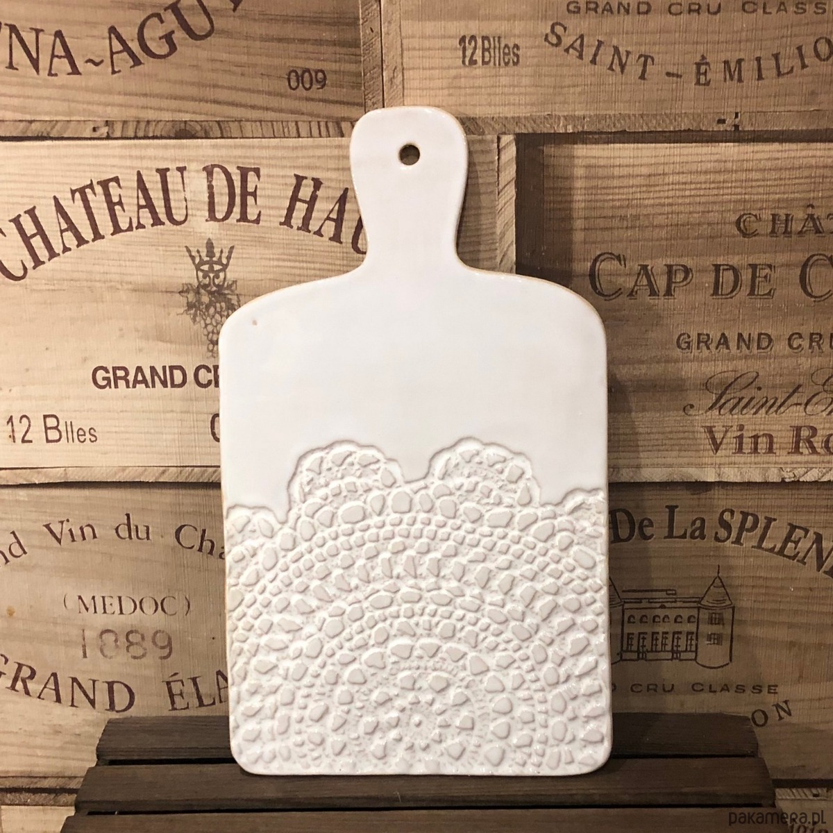 Deska do serwowania w kolorze białym z odciśniętym wzorem koronki. Została wykonana z jasnej gliny, pokryta szkliwem spożywczym (szkliwo zostało nałożone na wierzch deski, spód z surowej gliny).