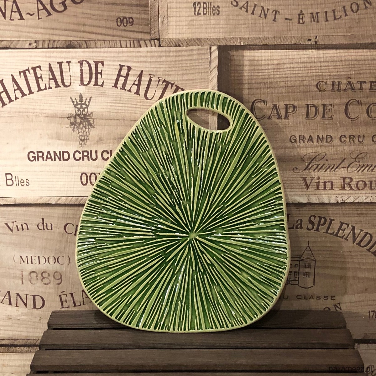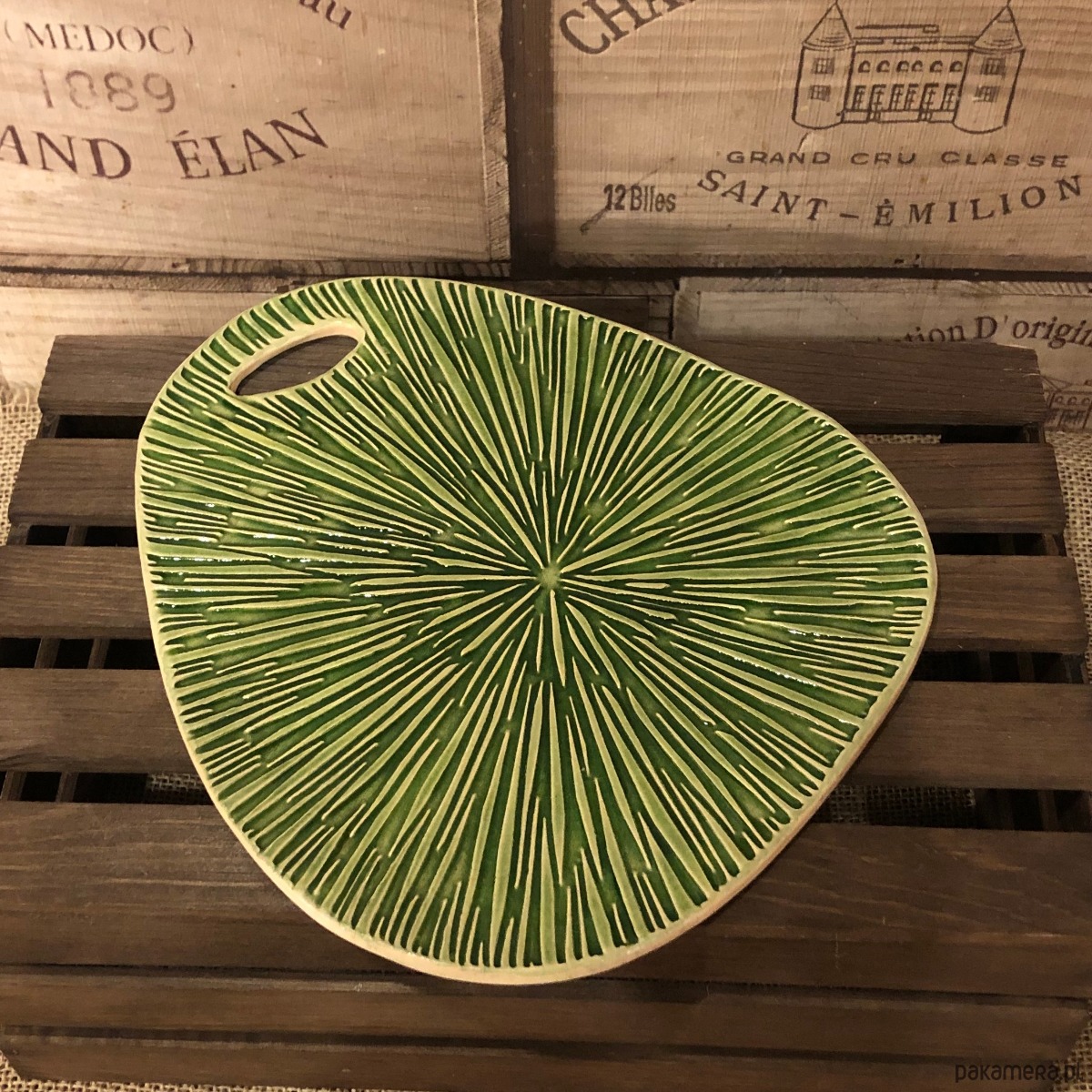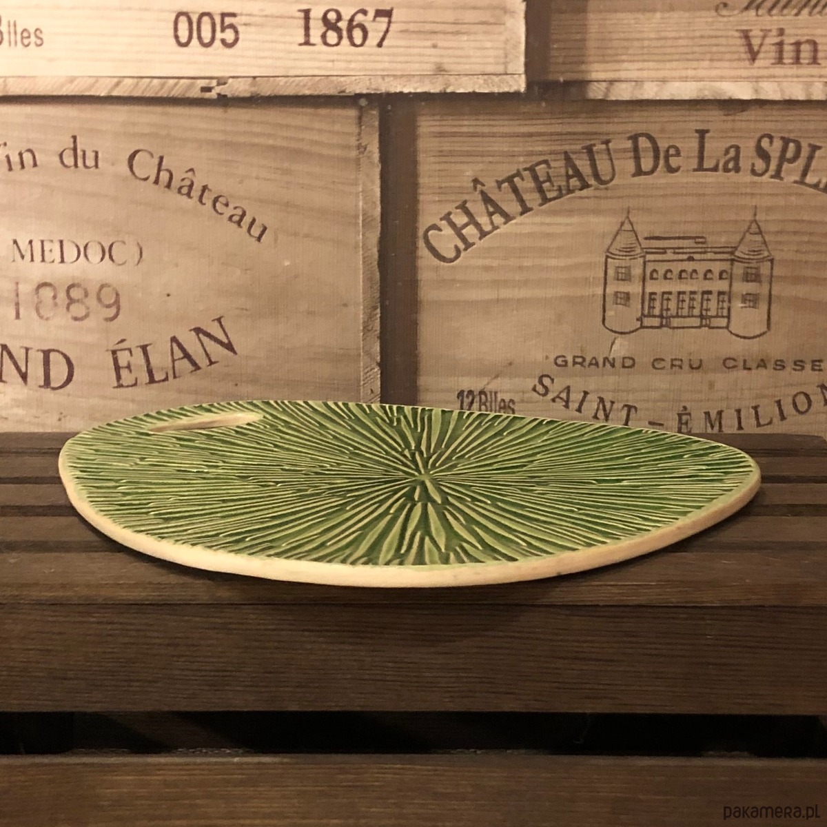 Deska do serwowania w kolorze soczystej zieleni z odciśniętym wzorem. Została wykonana z jasnej gliny, pokryta szkliwem spożywczym (szkliwo zostało nałożone na wierzch deski, spód z surowej gliny).