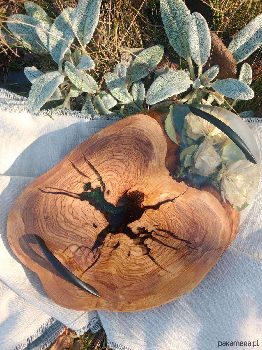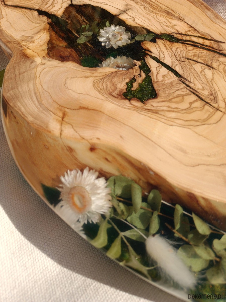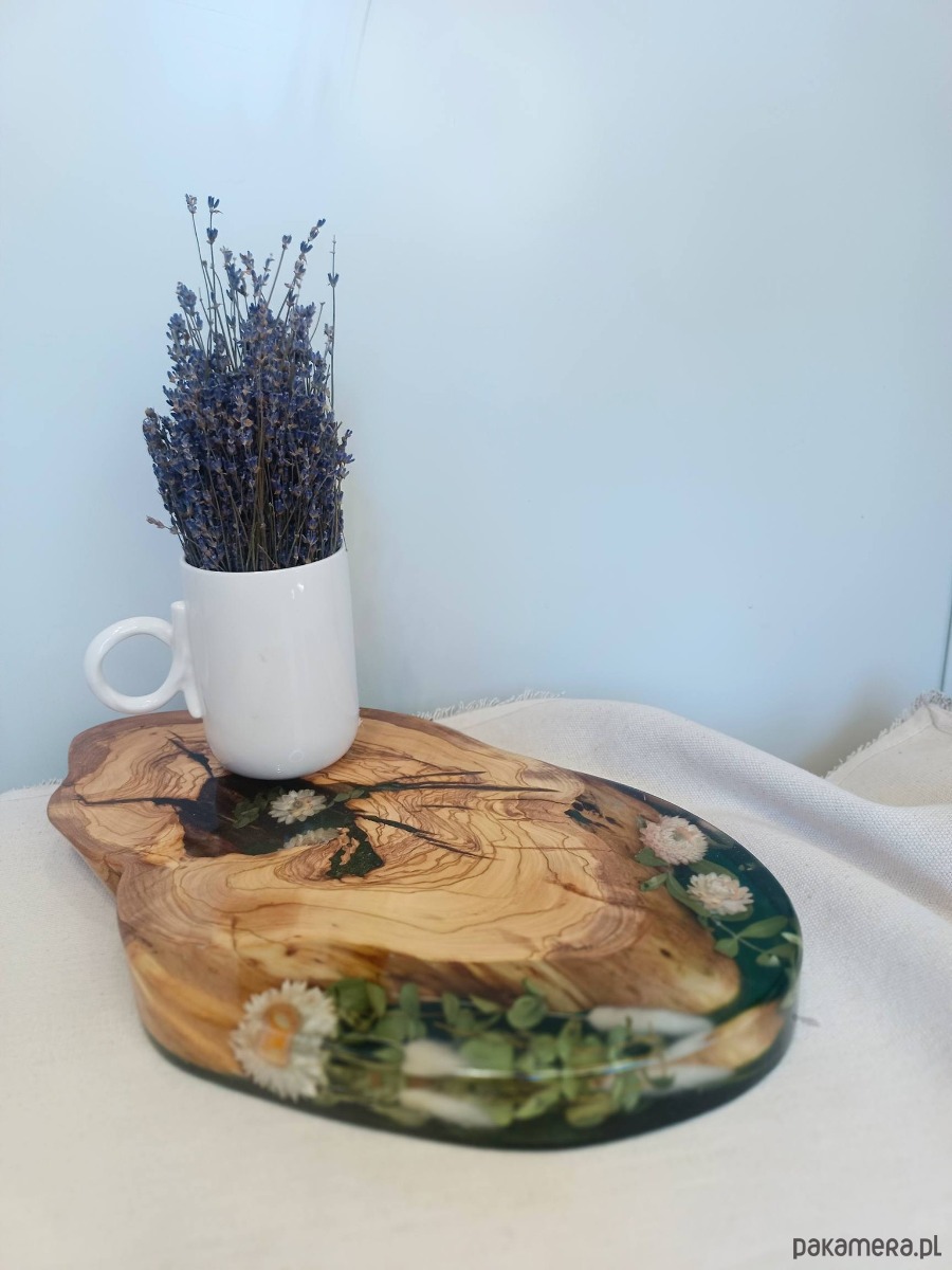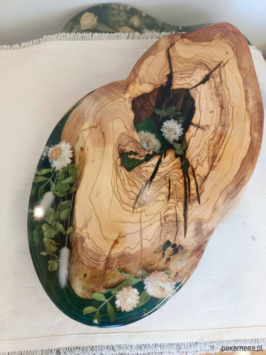 Materiał: drewno oliwne, żywica epoksydowa (powłoka top coat w połysku).