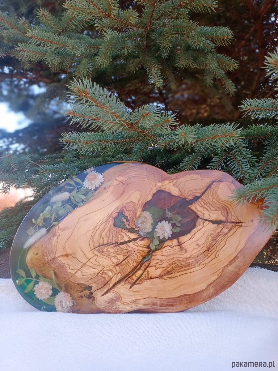 Elegancka, personalizowana deska do serwowania wykonana z naturalnego plastra drewna oliwnego o unikatowym usłojeniu i nieregularnych, organicznych krawędziach. Jej charakter podkreśla oliwkowo-zielone tło, które harmonijnie współgra z delikatną kompozycją jasnych kwiatów oraz subtelnymi gałązkami eukaliptusa zatopionymi w żywicy epoksydowej.