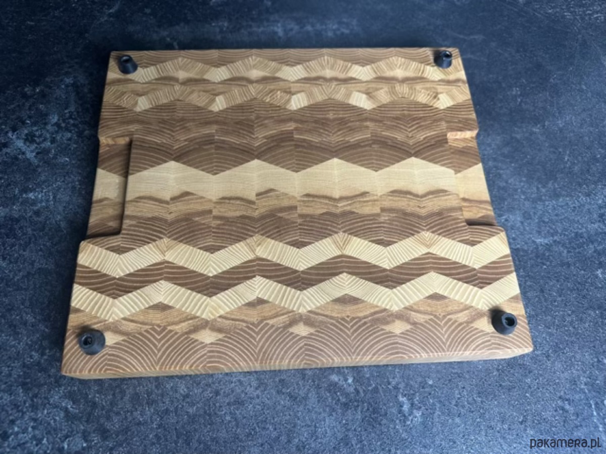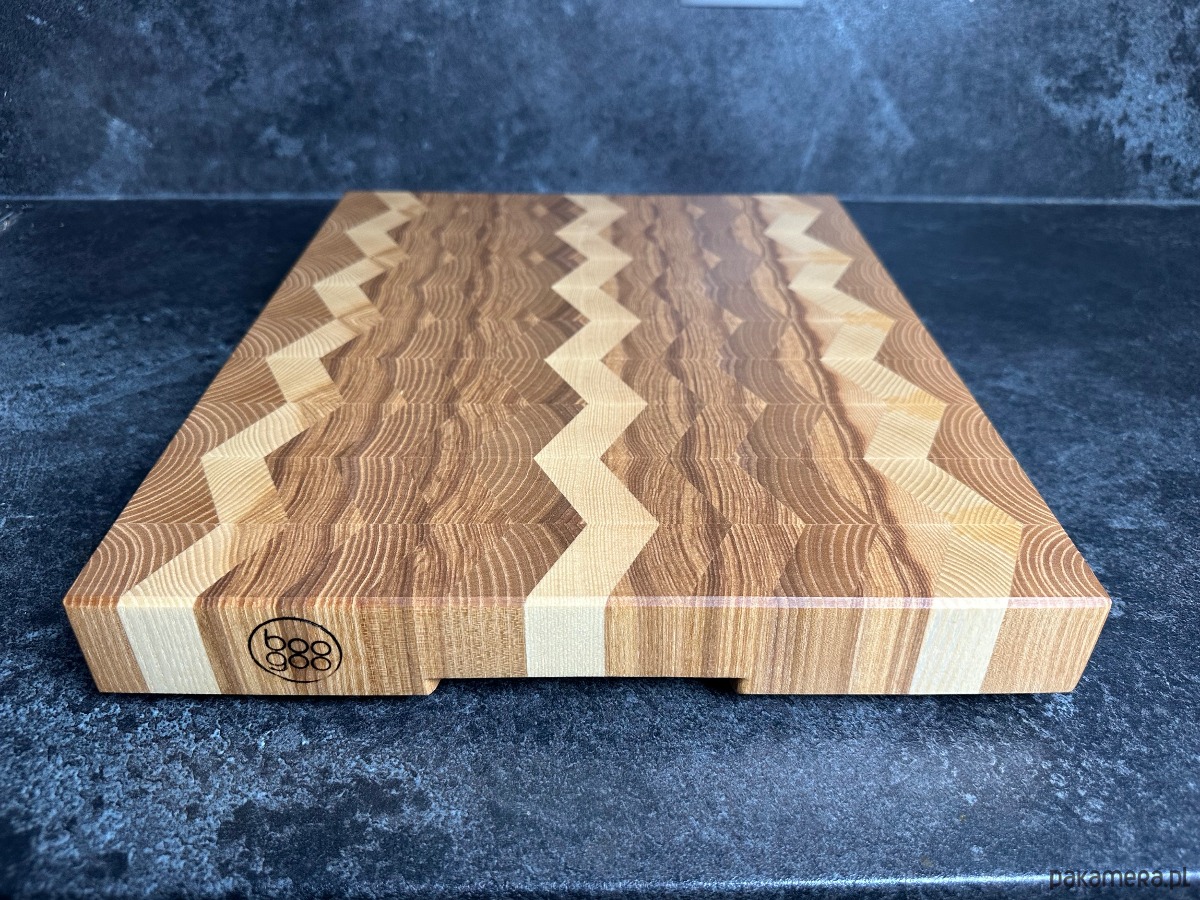 Format 29,5 × 34 cm zapewnia wygodną przestrzeń roboczą, a grubość 4 cm + 1 cm antypoślizgowych nóżek gwarantuje stabilność oraz komfort użytkowania. Dzięki nóżkom deska nie ślizga się po blacie i ma lepszą cyrkulację powietrza od spodu. Każda sztuka jest ręcznie wykańczana, olejowana bezpiecznymi dla żywności preparatami i unikatowa — nie ma dwóch identycznych egzemplarzy.