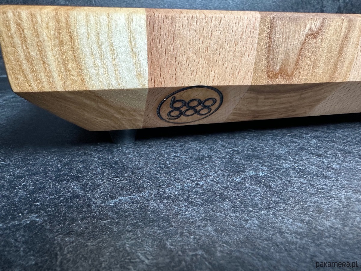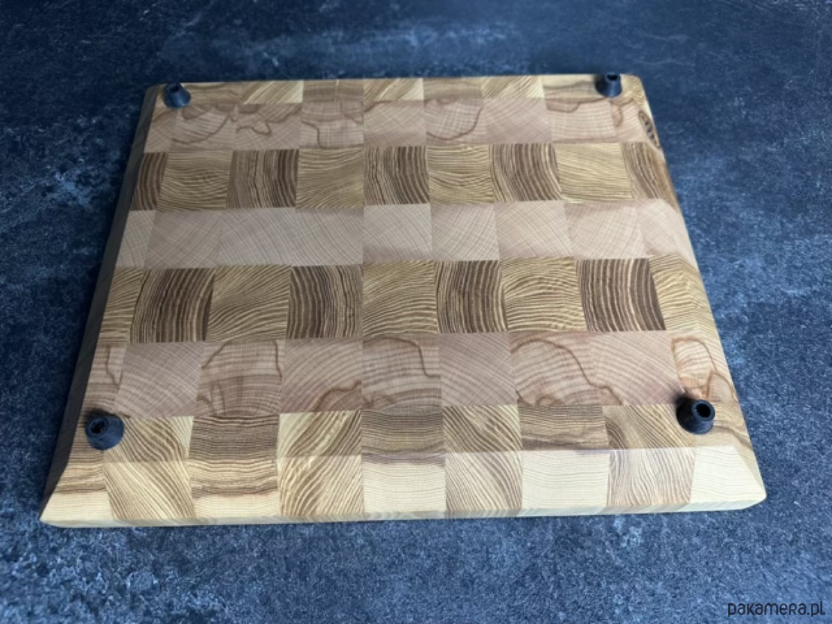 Deska jest lekko podcięta od spodu dla wygodnego chwytu, a gumowe antypoślizgowe nóżki zapewniają stabilność i chronią blat przed wilgocią. Każdy egzemplarz to unikat — naturalne usłojenie drewna sprawia, że nie ma dwóch identycznych sztuk.