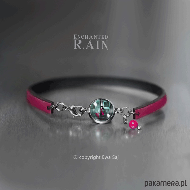 Oryginalna delikatna, kobieca bransoletka z kolekcji Zaczarowany Deszcz . Grafika została ukryta pod 10 mm wypukłym szkiełkiem. Pasek w kolorze amarantowym ma szerokość 5 mm, dodatki w kolorze ciemnego srebra. Idealna na nadgarstek 14,5 - 15,5 cm. Zrób sobie prezent! Wolny od niklu i ołowiu - antyalergiczny. copyright Ewa Saj. All Rights Reserved.