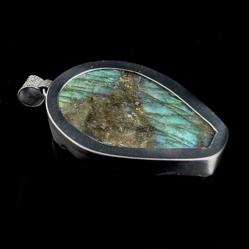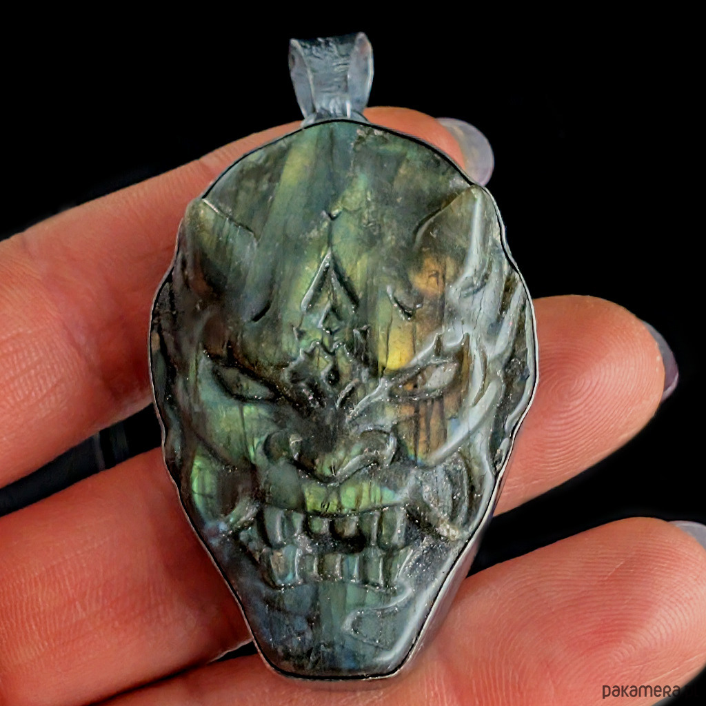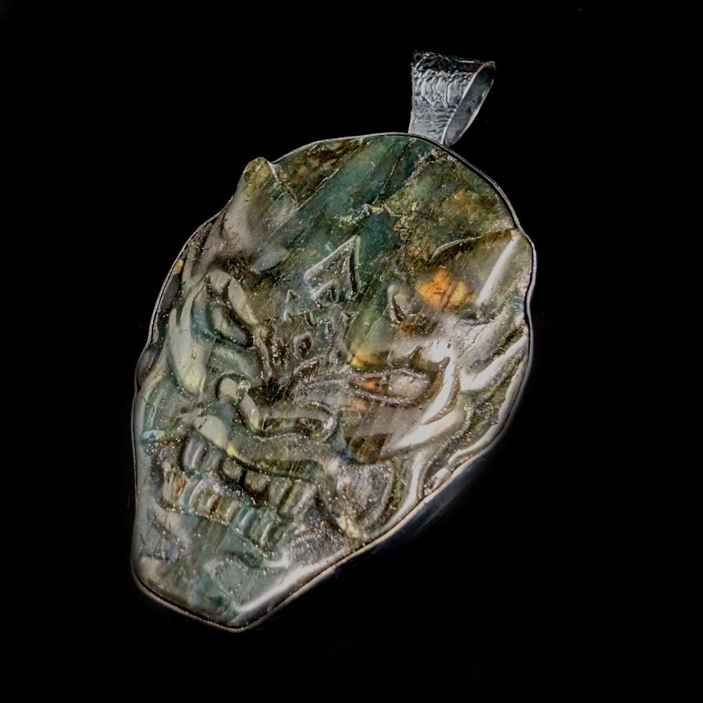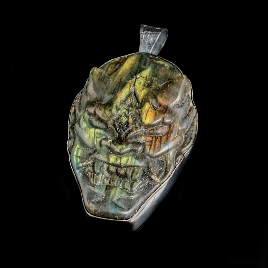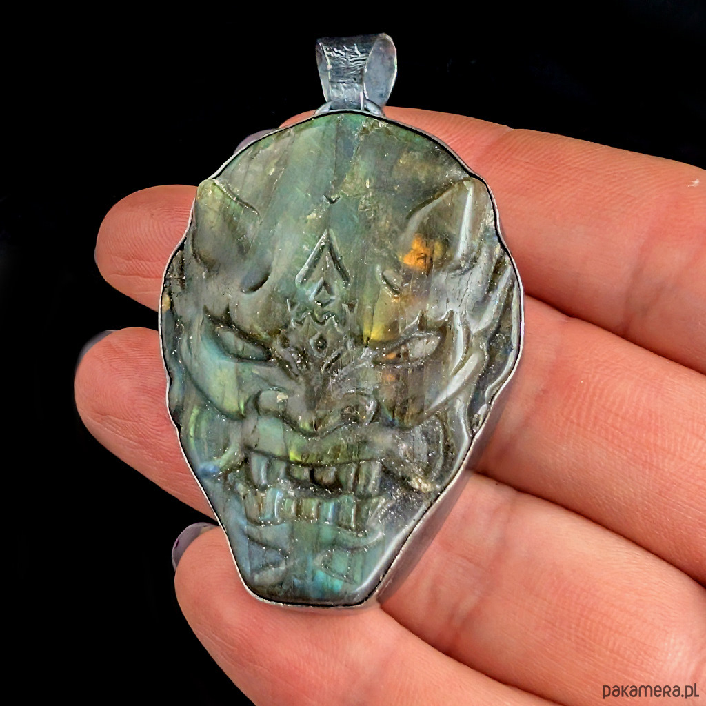 Okazały wisior z oksydowanego srebra próby 925 z oprawionym rzeźbionym w naturalnym labradorycie z diabelskim wizerunkiem. Gothic style. Wymiary oprawy 48 x 33 mm, długość 60 mm. Tył wisiora otwarty, ukazuje piękno całego kamienia,Waga 34 gramy. Zapakowany w ozdobne pudełeczko.