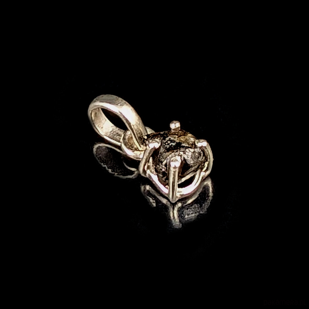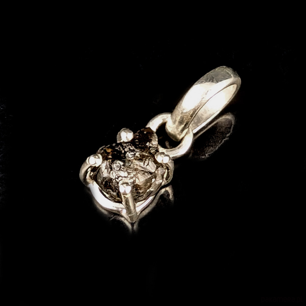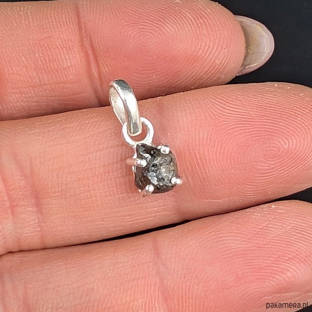 Delikatny wisiorek z osadzonym w srebro próby 925 surowym diamentem. Oprawa kamienia ma średnicę 6 mm. Długość 13 mm, waga 1 g Wykonany przez dostawcę kamieni. Wysłany w ozdobnym pudełeczku.