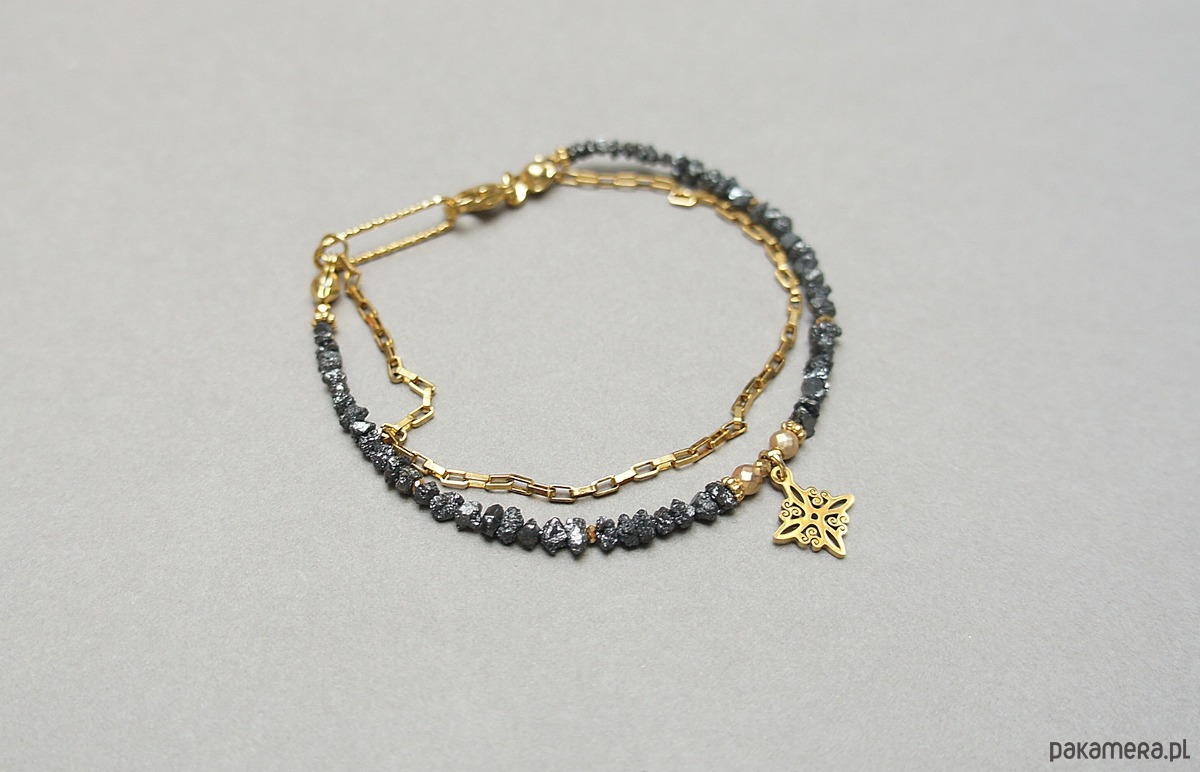 Delikatna bransoletka wykonana w całości z pozłacanej stali szlachetnej oraz naturalnych, szlachetnych kamieni - bryłki surowych diamentów w kolorze czarnym [ok. od 2mm do 4mm], hematytów fasetowanych, platerowanych [3mm], przekładek z hematytu [1mm]. Całkowita długość bransoletki: 19cm (na życzenie możemy dopasować do dowolnego nadgarstka). Biżuteria ozdobnie zapakowana. Do kompletu można dokupić naszyjnik przedstawiony na zdjęciach.