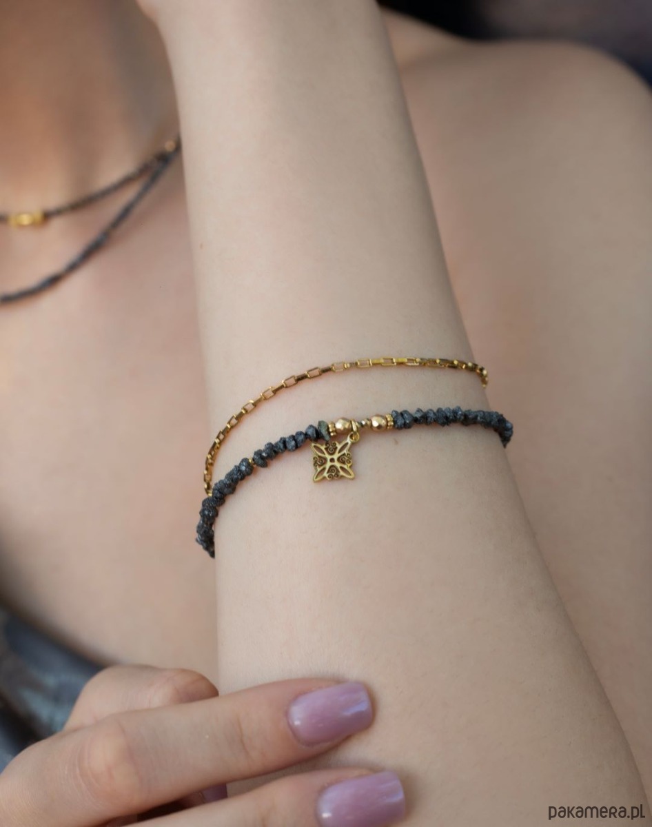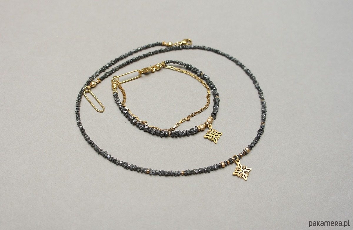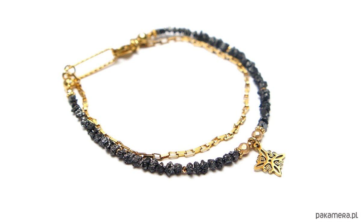 Delikatna bransoletka wykonana w całości z pozłacanej stali szlachetnej oraz naturalnych, szlachetnych kamieni - bryłki surowych diamentów w kolorze czarnym [ok. od 2mm do 4mm], hematytów fasetowanych, platerowanych [3mm], przekładek z hematytu [1mm]. Całkowita długość bransoletki: 19cm (na życzenie możemy dopasować do dowolnego nadgarstka). Biżuteria ozdobnie zapakowana. Do kompletu można dokupić naszyjnik przedstawiony na zdjęciach.