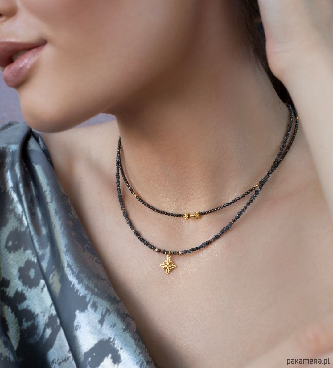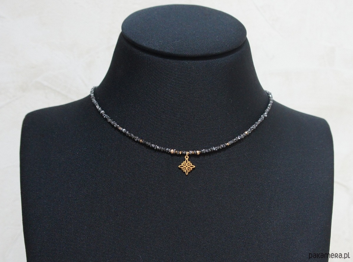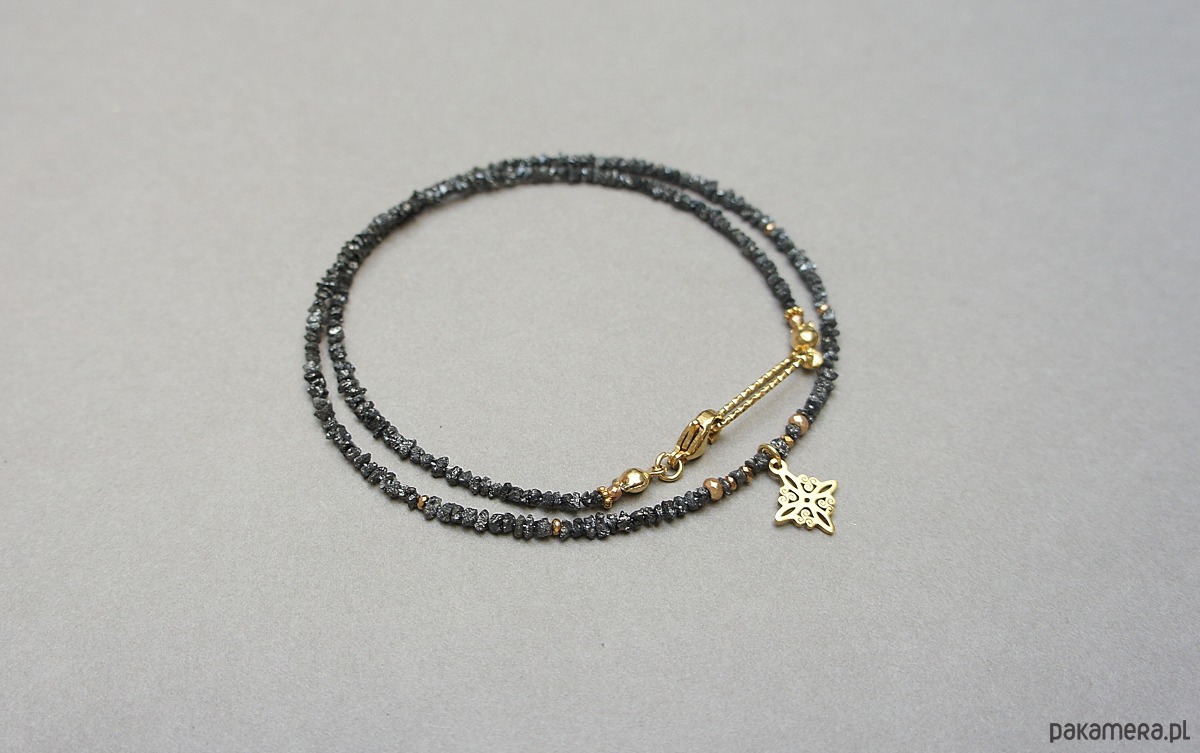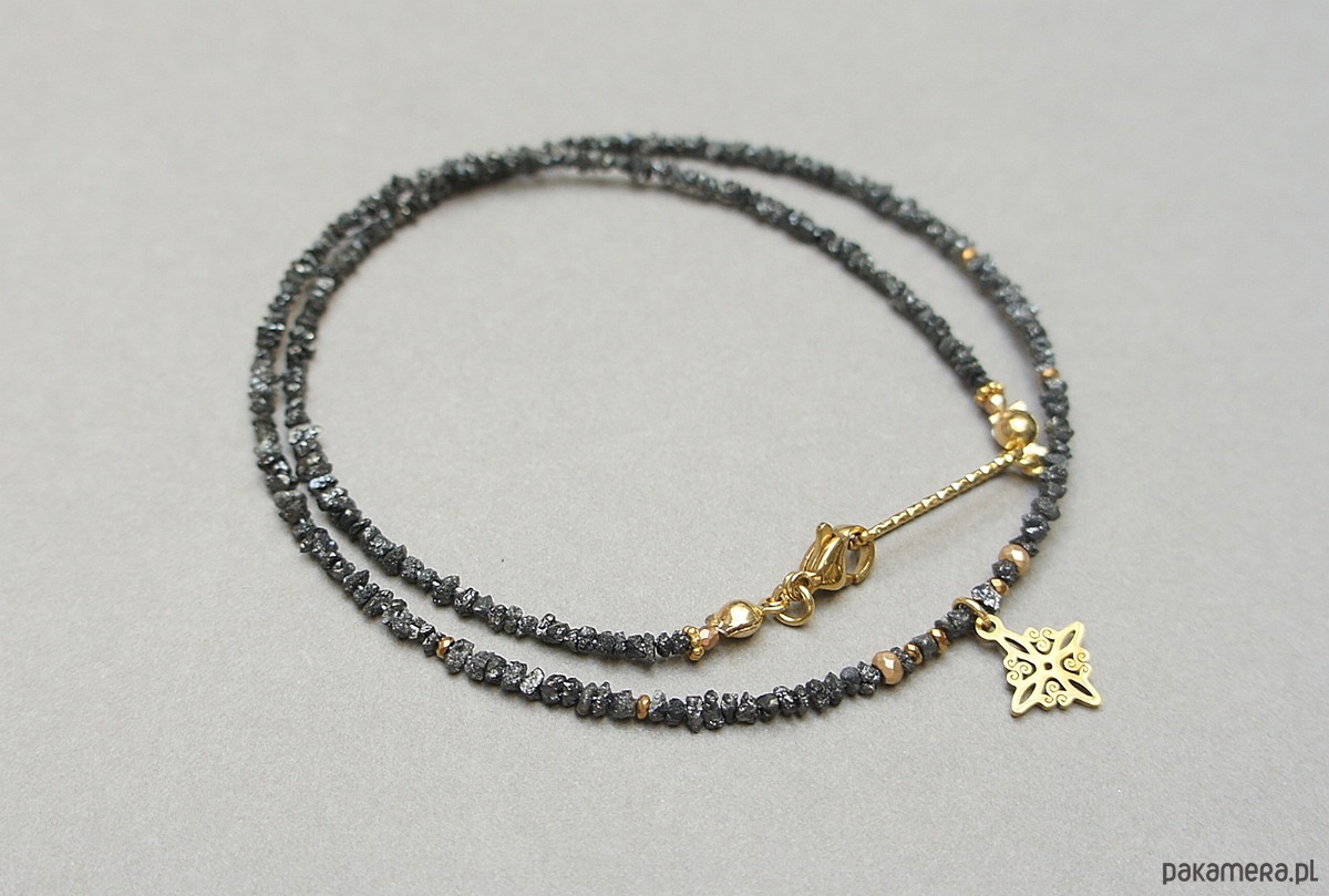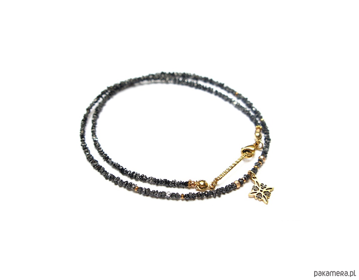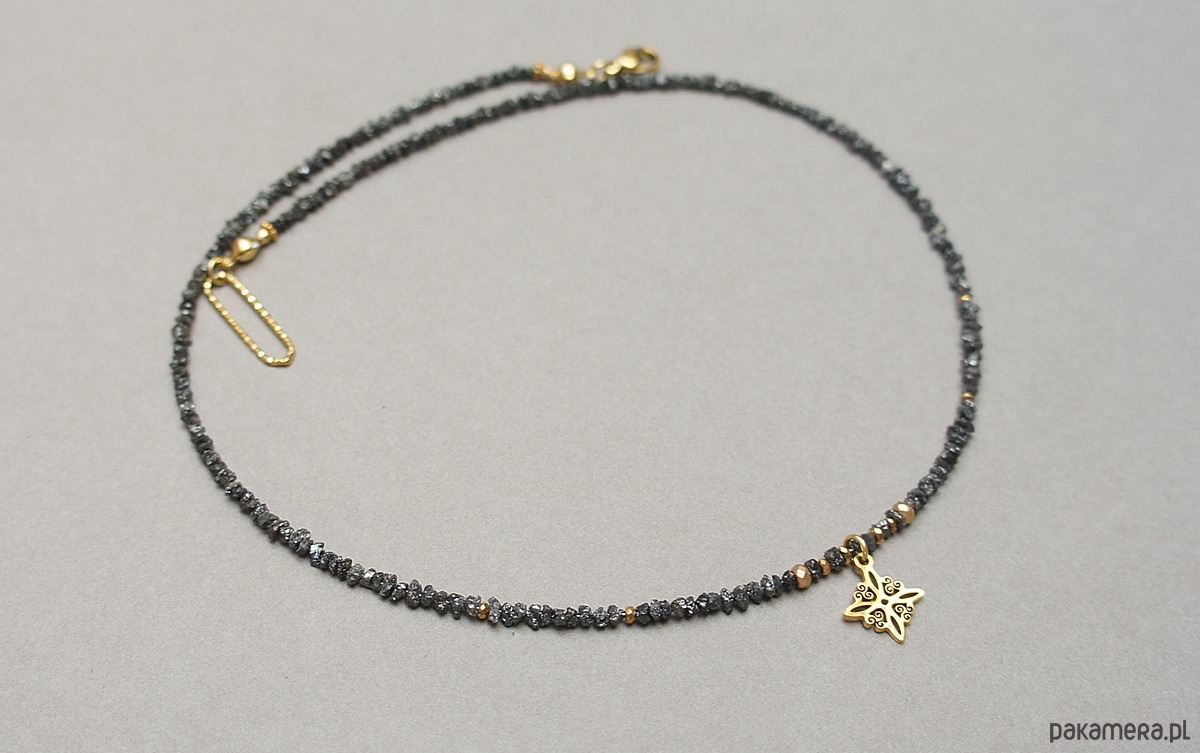 Krótki naszyjnik wykonany w całości z pozłacanej stali szlachetnej oraz naturalnych, szlachetnych kamieni - bryłki surowych diamentów w kolorze czarnym [ok. od 1 do 4mm], hematyt fasetowany o matowej powłoce [2 i 4mm], przekładek z hematytu [1mm]. Naszyjnik o długości ok. 43cm. Do kompletu można dokupić bransoletkę - widoczną na zdjęciach.