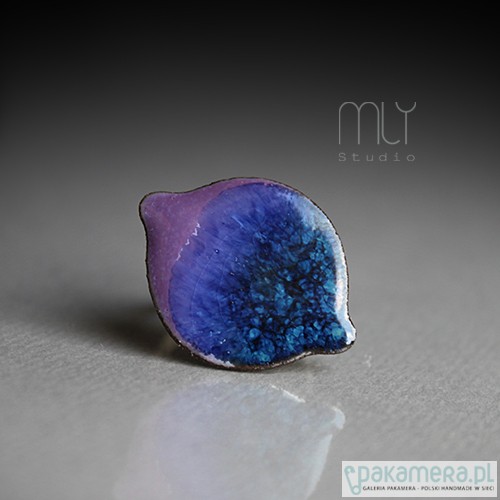 Oryginalna ceramiczna broszka, wykonana z delikatnej gliny kamionkowej, szkliwiona mieszanką fioletowych i błękitnych szkliw z efektem plamek, zapięcie w kolorze srebrnym. Długość ok. 2,6cm. Polecam . .