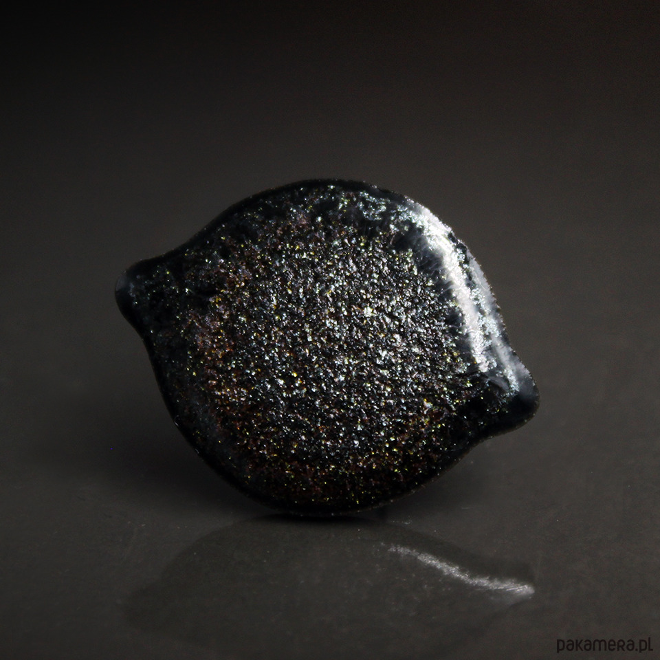 Oryginalna ceramiczna broszka, wykonana z delikatnej gliny kamionkowej, szkliwiona mieszanką czarnych i brązowych szkliw z efektem połyskujących drobinek, zapięcie w kolorze starego złota. Długość ok. 2,6cm. Polecam