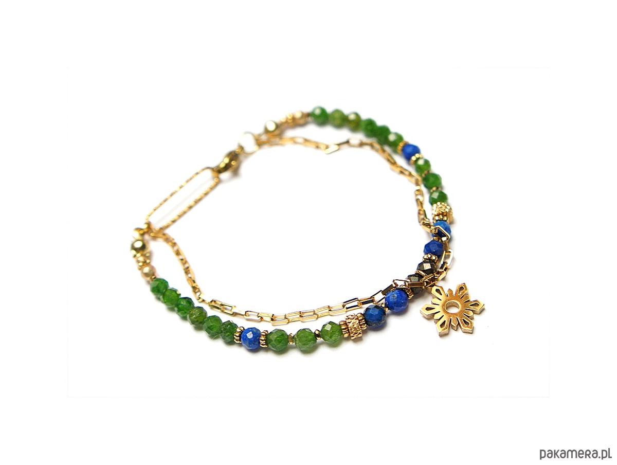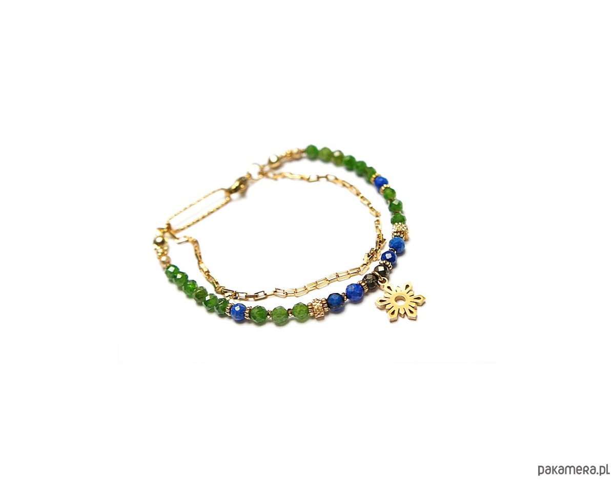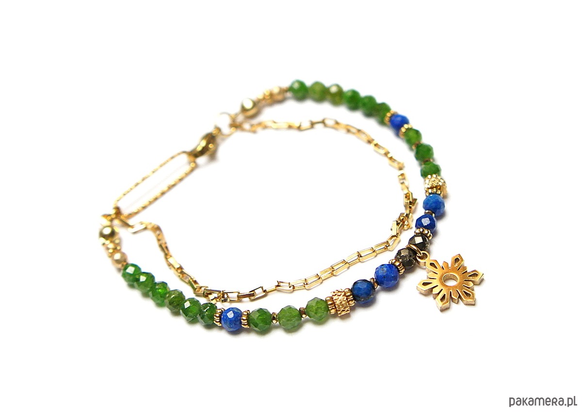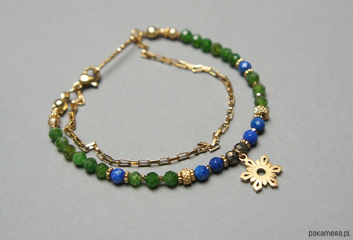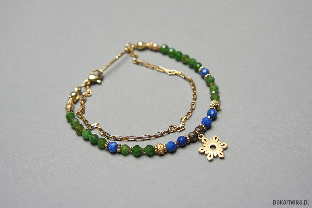 Delikatna bransoletka wykonana w całości ze stali szlachetnej pozłacanej oraz naturalnych, szlachetnych kamieni - fasetowanych kuleczek diopsydu [śr. 4mm], fasetowanych kuleczek pirytu [3,5mm], fasetowanych kuleczek lapis lazuli [4mm], przekładek z hematytu [1mm]. Całkowita długość bransoletki: ok. 18cm. Na życzenie możemy pomniejszyć lub powiększyć bransoletkę - wcześniej prosimy o kontakt.