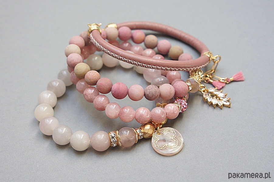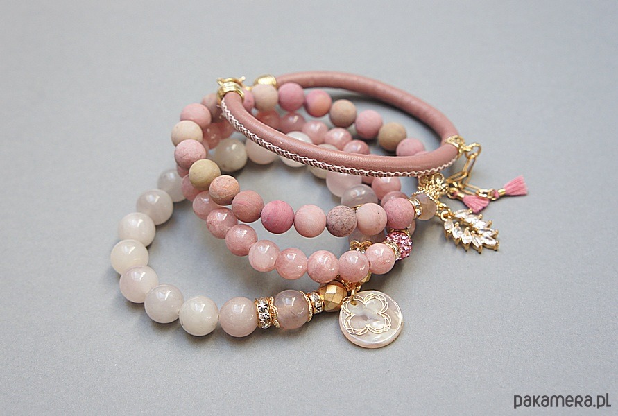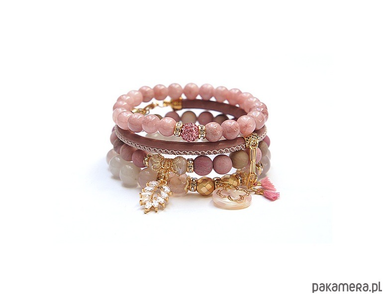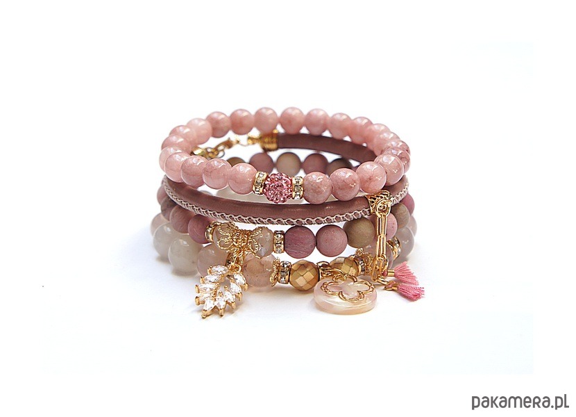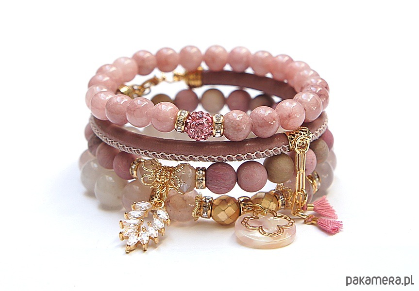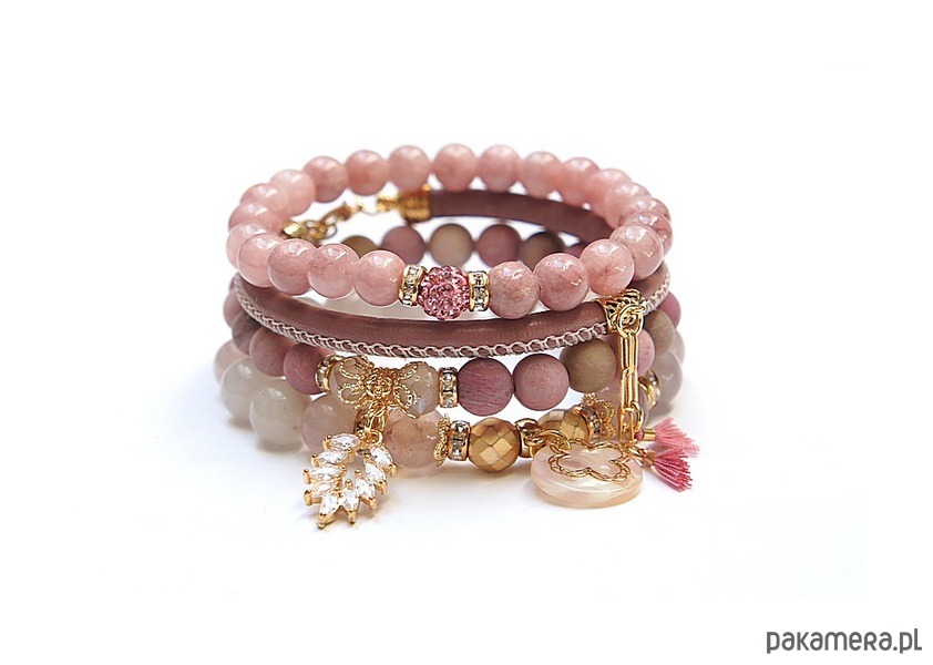 Komplet czterech bransoletek wykonanych z naturalnych kamieni: jadeity [10mm], rodochrozyt matowy [8mm], marmur [8mm], hematyt fasetowany, platerowany [8mm], kryształków fasetowanych [8mm], rzemienia z naturalnej skórki, zawieszki wysadzanej cyrkoniami, zawieszki z żywicy, kuleczki shamballa wysadzanej kryształkami [8mm], chwostów oraz elementów metalowych w kolorze złota. Bransoletki pasują na nadgarstek 16 - 17cm. Biżuteria ozdobnie zapakowana