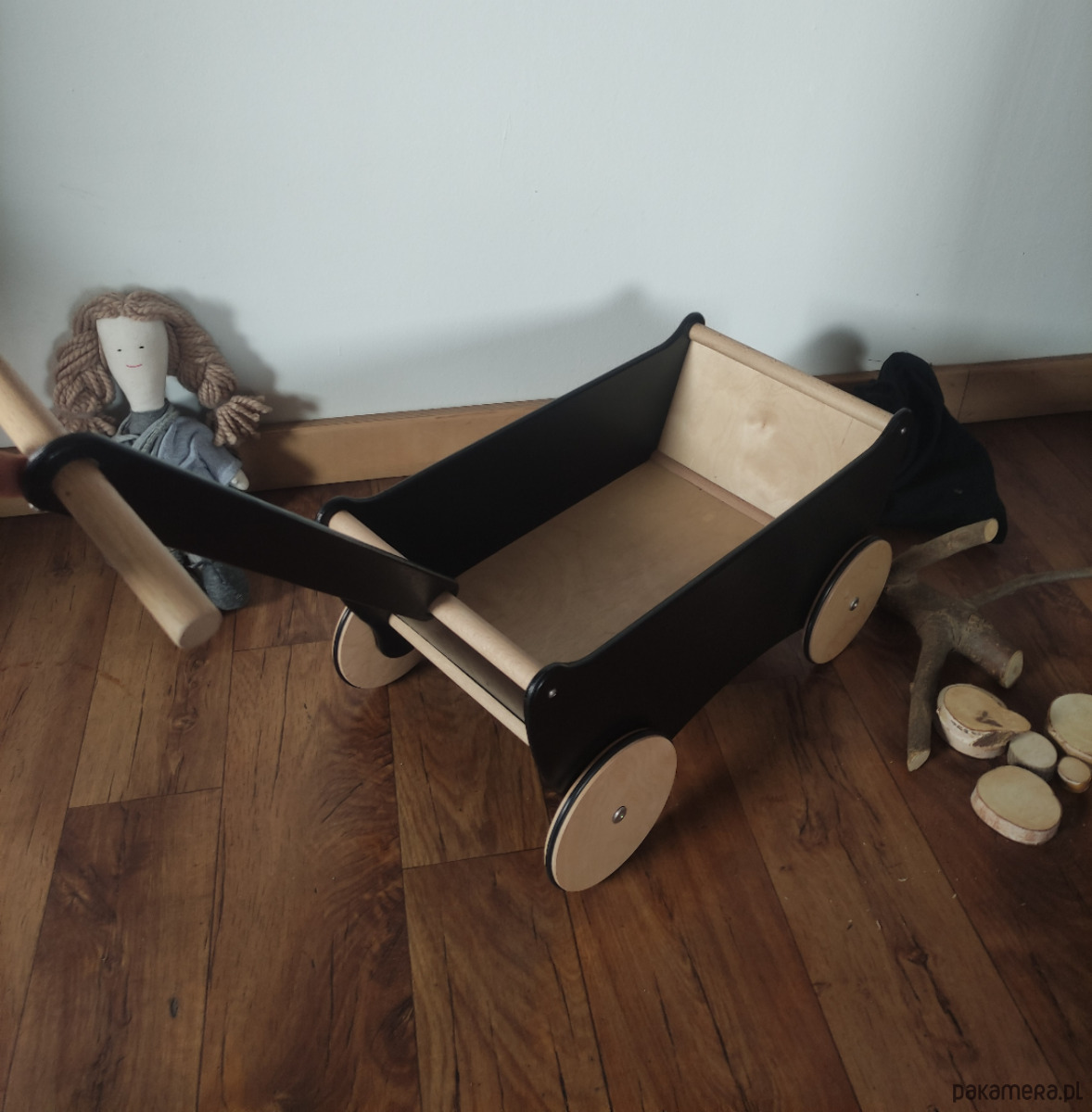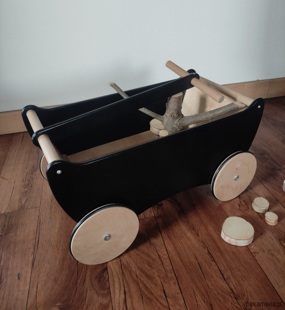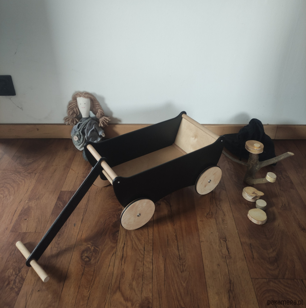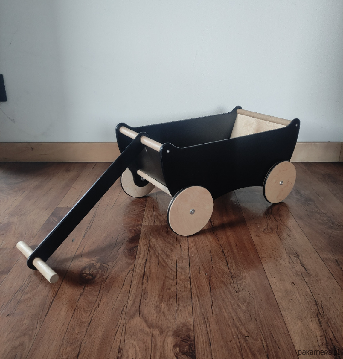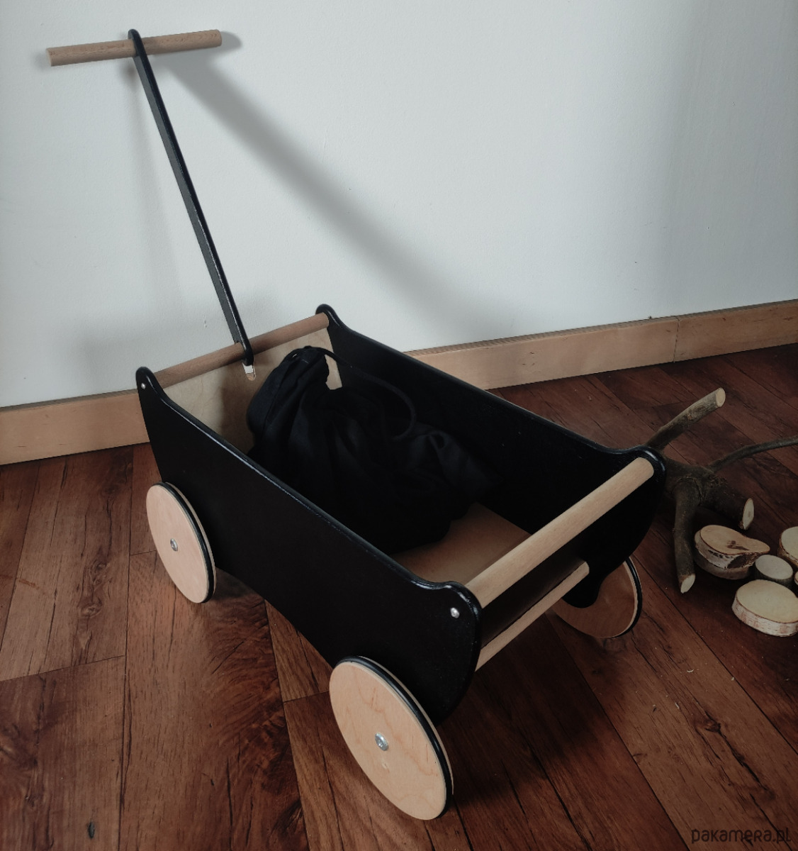 Niepowtarzalny ekologiczny drewniany wózek dla do ciągnięcia z dyszlem DISAR czarno-naturalny.