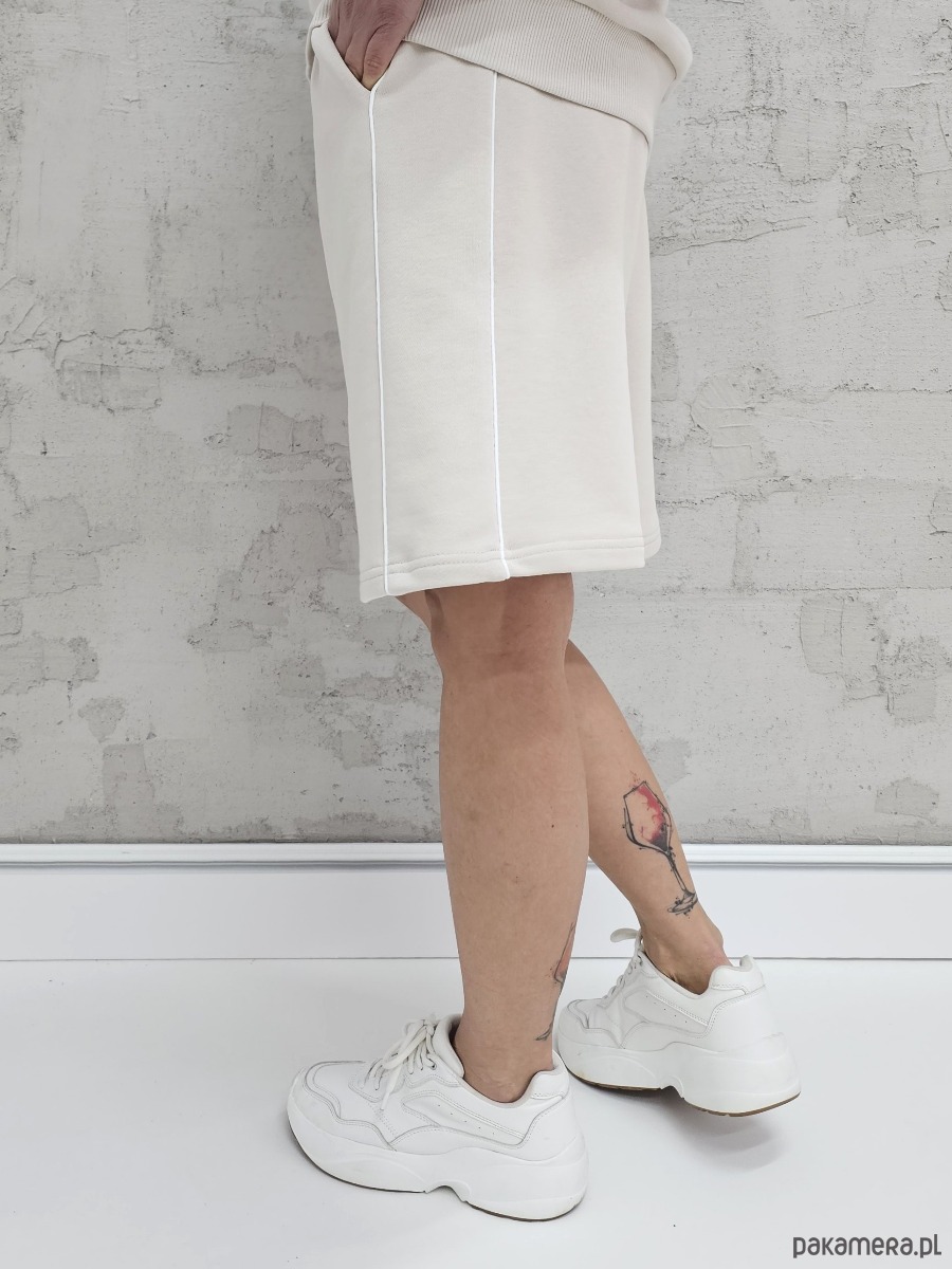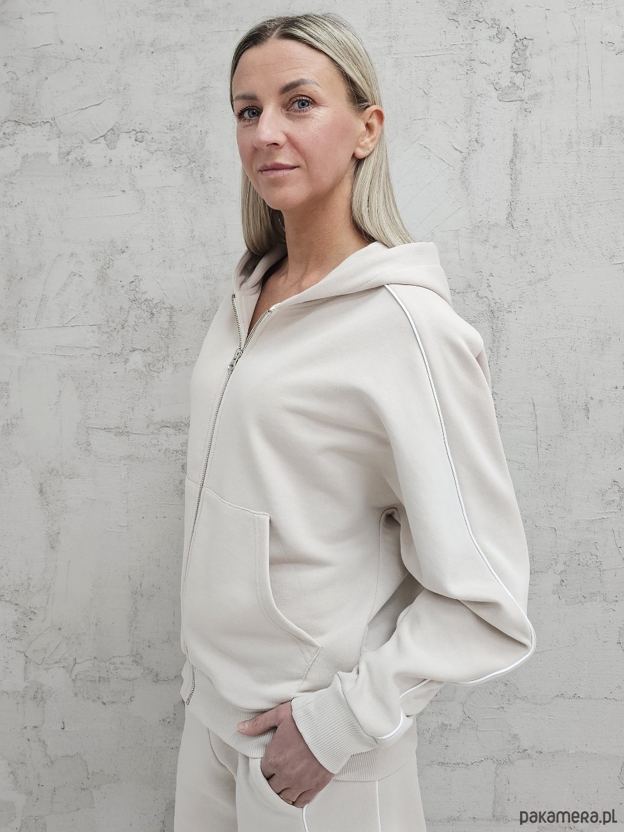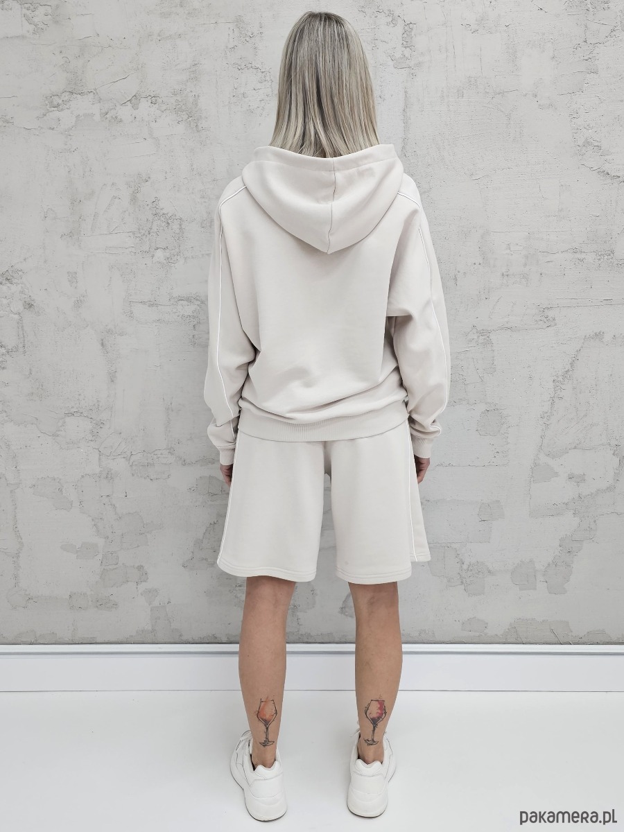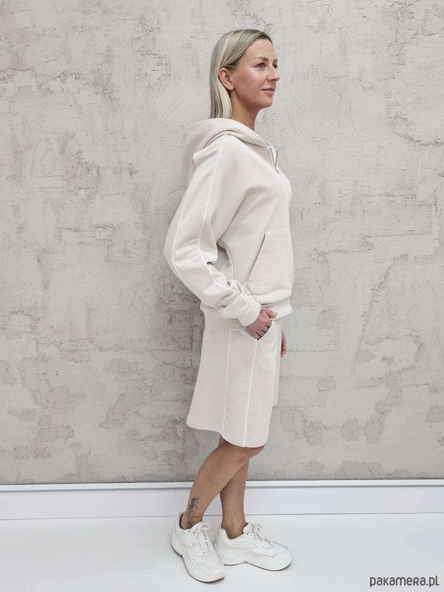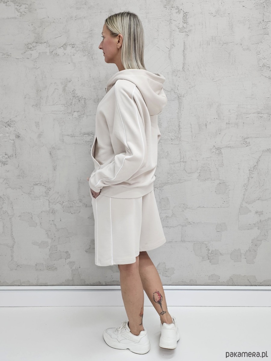 OPIS PRODUKTU- Oversizowy komplet Dita uszyty z naszego sygnowanego materiału superSOFT™. Komplet obejmuje luźną, oversizową bluzę kangurkę z lamówkami na rękawach, rozpinaną na zamek oraz spodenki o luźnym kroju z z lamówkami na bokach. W spodenkach elastyczny ściągacz z gumą i sznurkiem do płynnej regulacji obwodu.