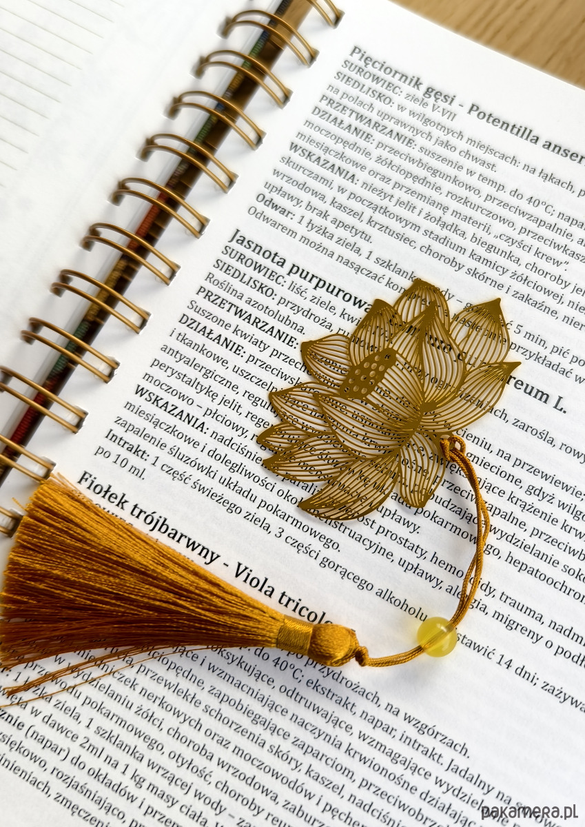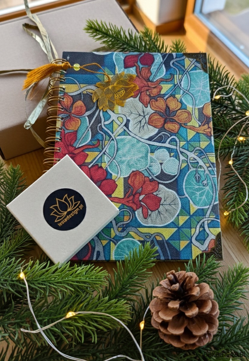 ZESTAW PREZENTOWY ZIELARKI Książkowy kalendarz zbioru ziół 2026 – okładka NASTURCJE z okuciami i złotą zakładką LOTOS