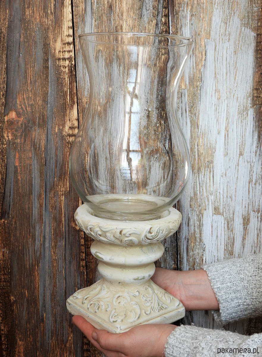 Dekoracyjny, duży świecznik w kolorze beżowy z szarymi przetarciami.