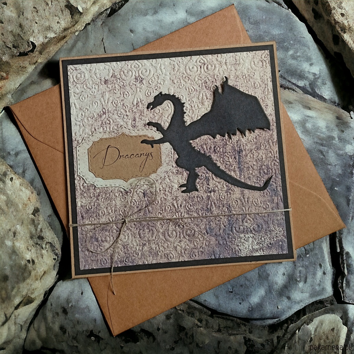wykonana na bazie grubego kartonu EKO-kraft (100% makulatury), ozdobiona czarnym kartonem, wzorzystym , fakturowanym papierem, przestrzennymi elementami. przewiązana jutowym sznureczkiem/