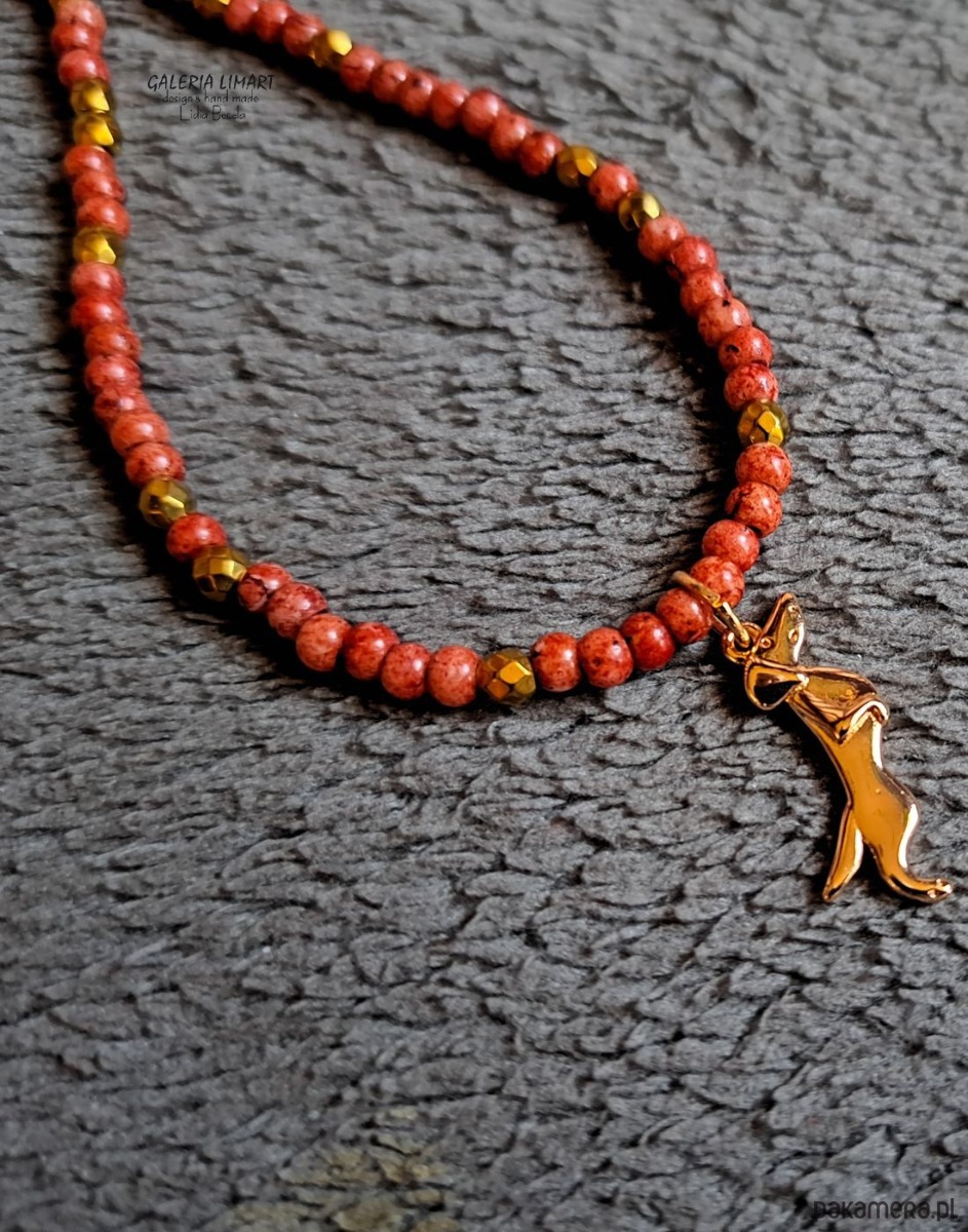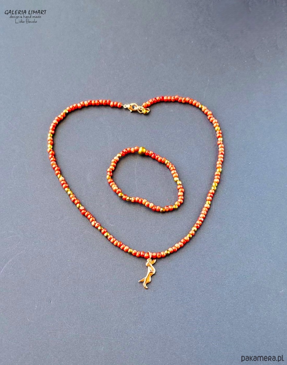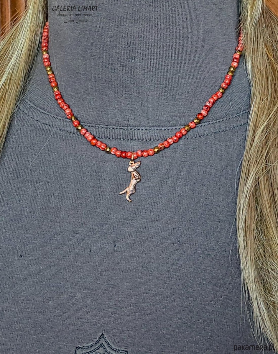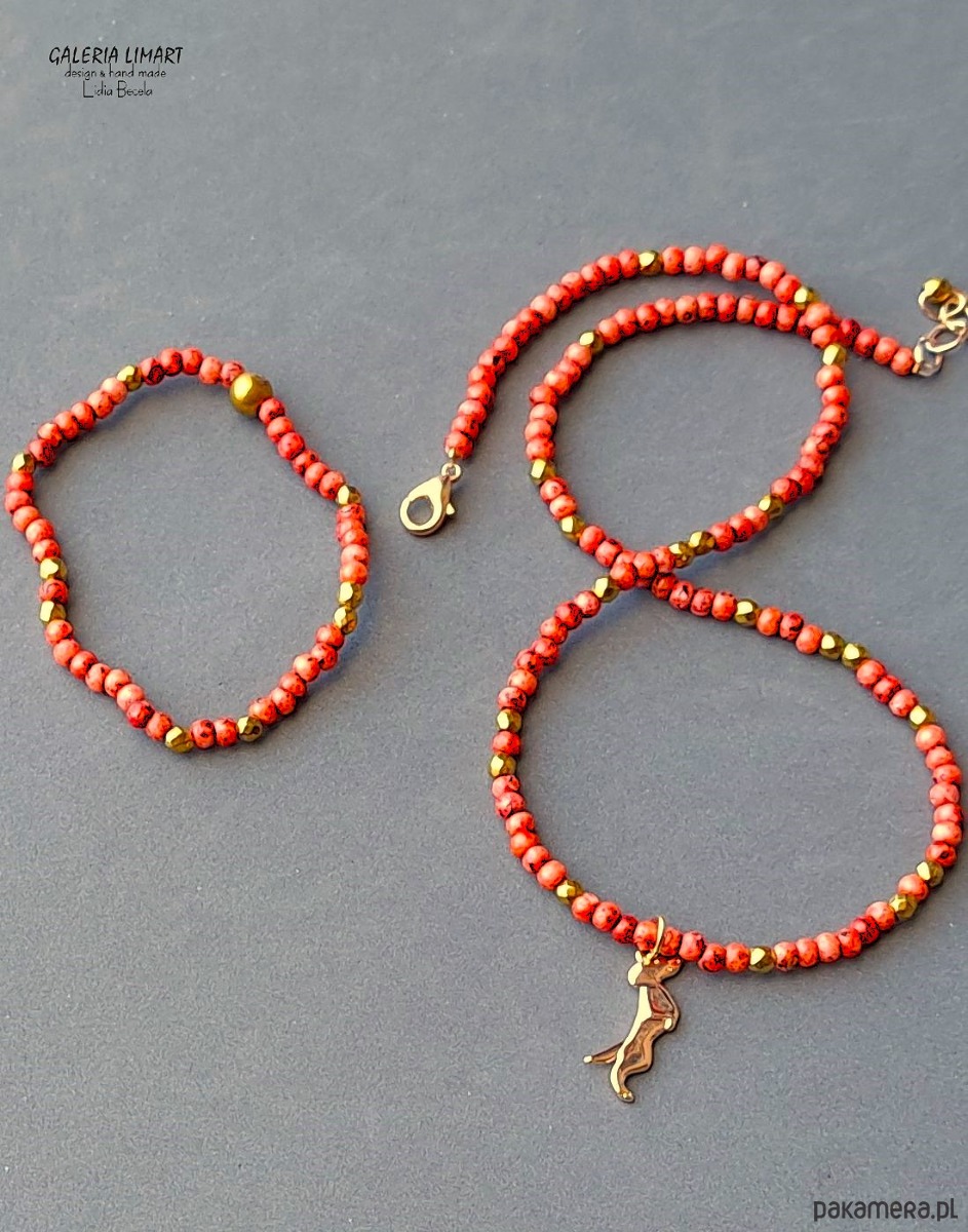 uroczy i zabawny, miły dla oka komplet - bransoletka i wisiorek - uroczy stalowy jamniczek (ok. 2 cm) zawieszony na drobnych czeskich koralikach picasso w pięknym ciepło-czerwonym odcieniu, z wplecionymi złotymi hematytami. Długość naszyjnika ok 45 cm + regulacja, bransoletka na elastycznym nośniku rozmiar na nadgarstek 15-17 cm.