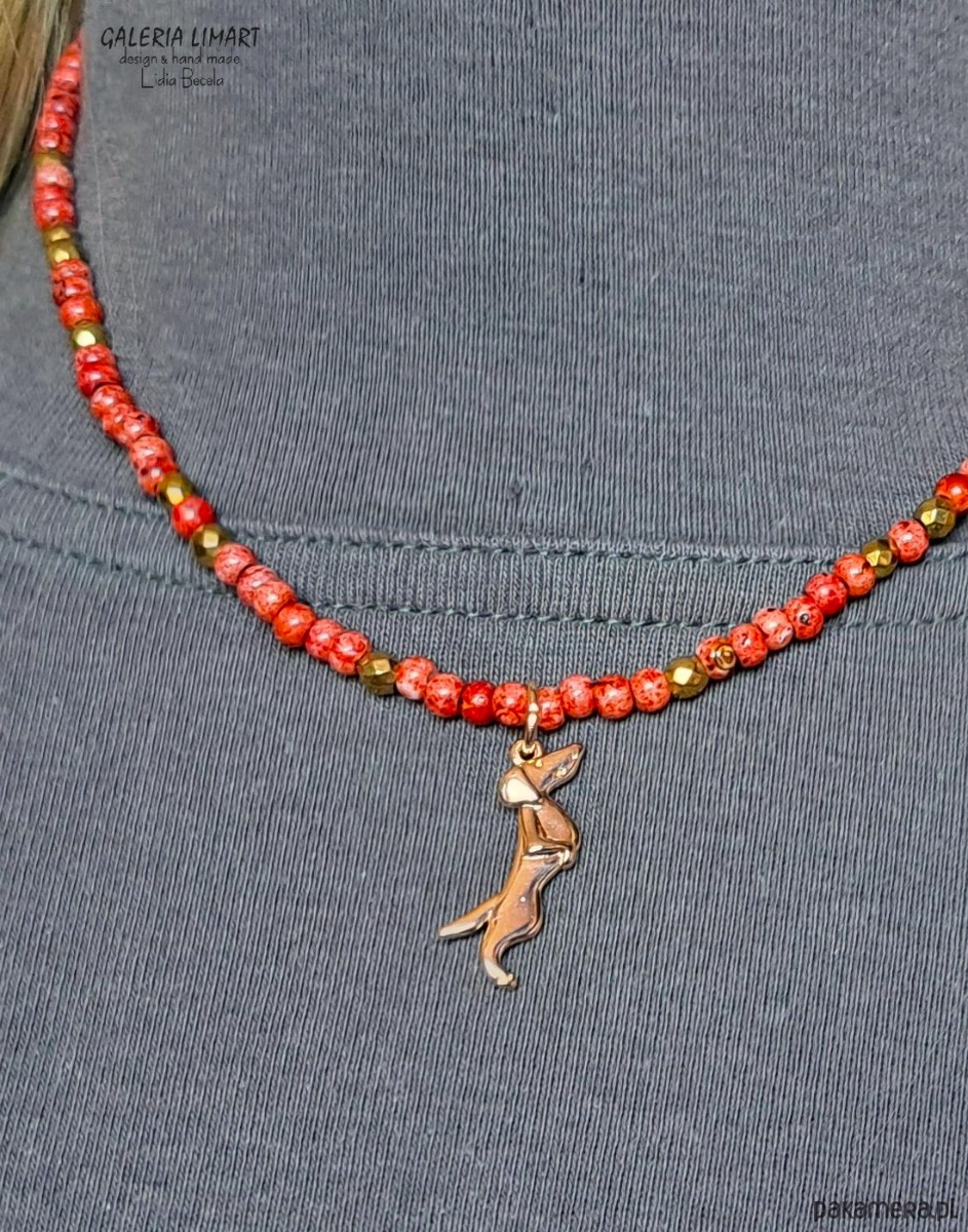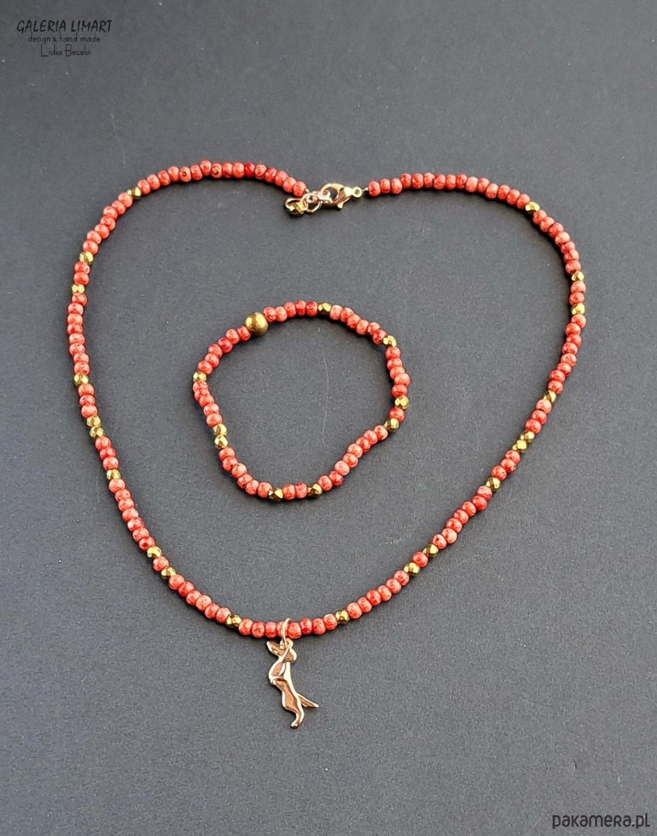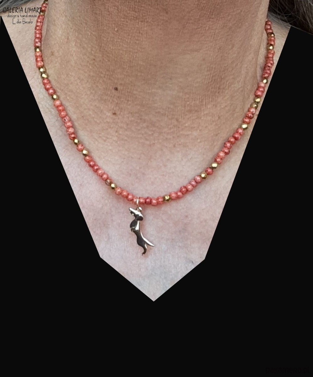 uroczy i zabawny, miły dla oka komplet - bransoletka i wisiorek - uroczy stalowy jamniczek (ok. 2 cm) zawieszony na drobnych czeskich koralikach picasso w pięknym ciepło-czerwonym odcieniu, z wplecionymi złotymi hematytami. Długość naszyjnika ok 45 cm + regulacja, bransoletka na elastycznym nośniku rozmiar na nadgarstek 15-17 cm.