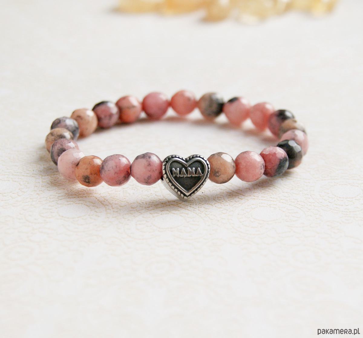 TUTAJ: urocza bransoletka dla TWOJEJ MAMUSI. wykonana z kul fasetowanego jadeitu rodonitowego (8mm), do tego dwustronna, masywna przekładka ze STALI SZLACHETNEJ (nie uczula, kolor nie ściera się) z napisem MAMA.... kamienie na solidnej lince elastycznej....