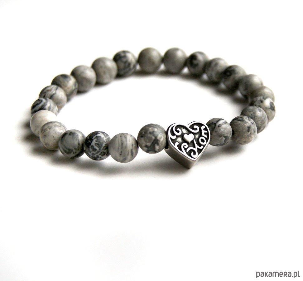 TUTAJ: urocza bransoletka dla TWOJEJ MAMUSI. wykonana z kul szarego jaspisu (8mm), ego dwustronna, masywna przekładka ze STALI SZLACHETNEJ (nie uczula, kolor nie ściera się) z napisem mom.... kamienie na solidnej lince elastycznej....