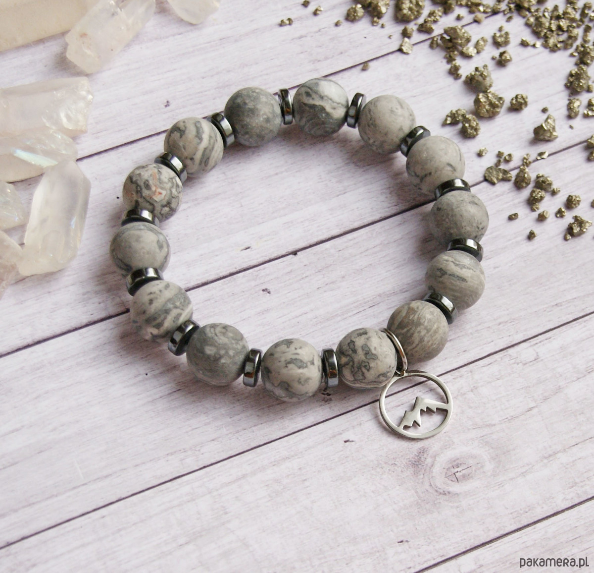wykonana ze sporych kul matowego szarego jaspisu koronkowego (12mm) i przekładek z grafitowego hematytu.