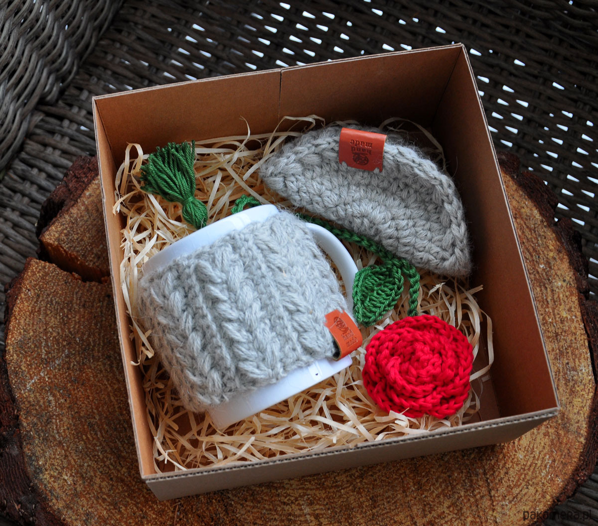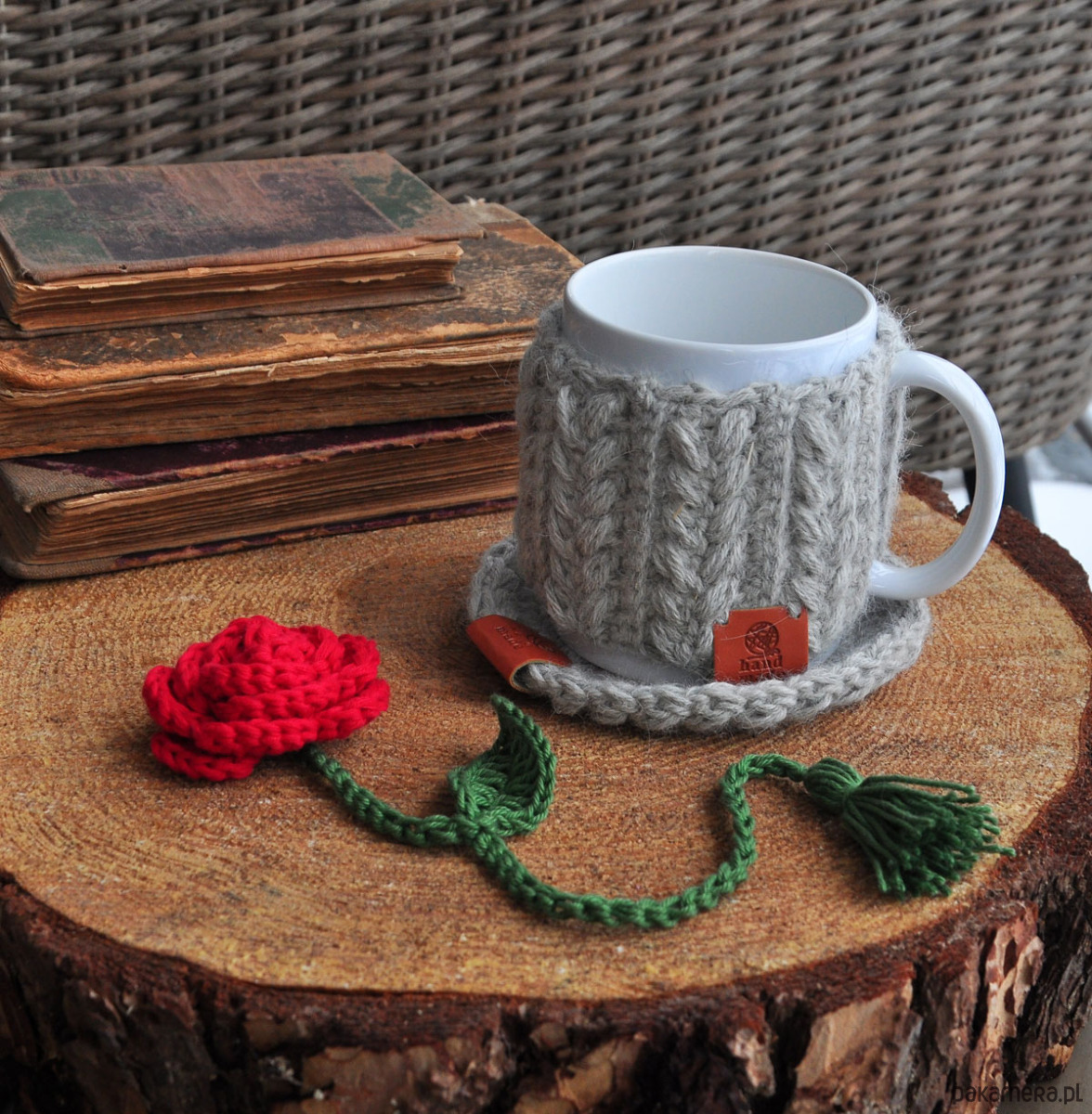 - kubek (biały, bez nadruku) w szydełkowym sweterku w warkocze, które można zdejmować,