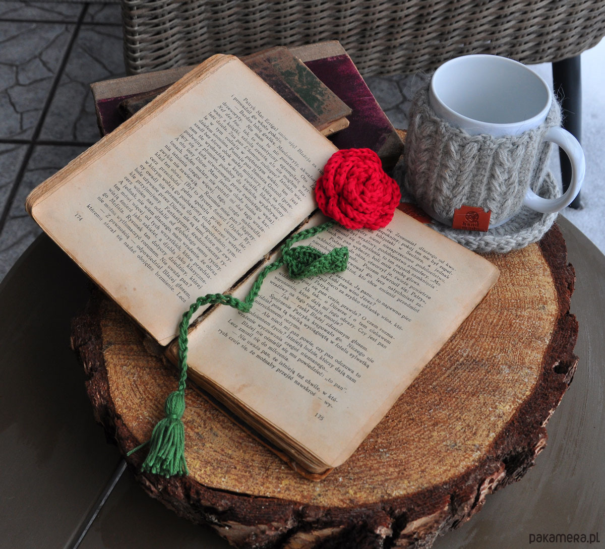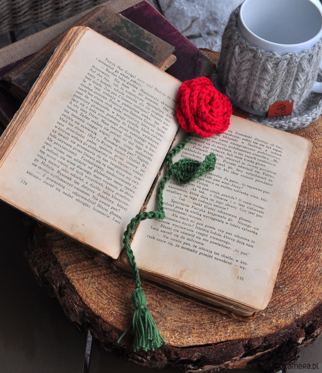 - szydełkową zakładkę do książki- różę
