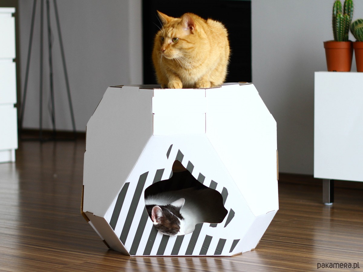 MIA to wielofunkcyjny mebel z przeznaczeniem na instynktowne dla kotów czynności takie, jak: CHOWANIE SIĘ (kryjówka), SPANIE (leżanka), ZABAWA (zabawka). MIA jest dwustronnym domkiem, co oznacza, że możesz ją złożyć zarówno na białą, jak i na brązową stronę. Mocna i stabilna konstrukcja oraz wytrzymała tektura, pozwalają kotom na swobodne wskakiwanie na górę domku MIA, co daje im więcej możliwości na spędzanie czasu zarówno w środku domku, jak i na jego górze. Dwa niezależne wejścia zapewniają kotom poczucie swobody, lepszą obserwację otoczenia oraz lepsze wykorzystanie domku MIA w trakcie zabawy. Przestronne wnętrze pomieści więcej niż jednego kota. MATA TEKTUROWA - załączona w środku. Materiał: naturalna tektura falista. Kolor: biały i brązowy. Wymiary w cm (wysokość x głębokość x szerokość) 48x58x57. Instrukcj