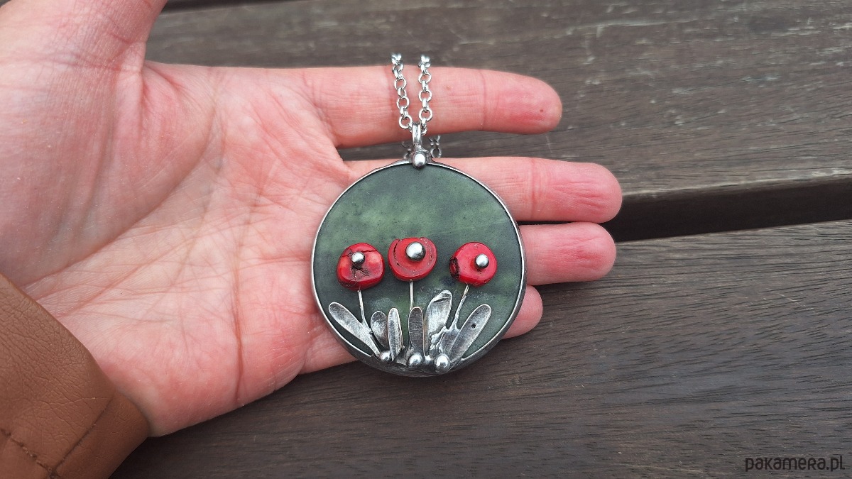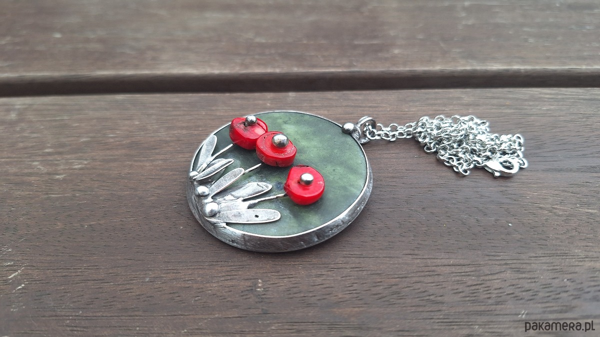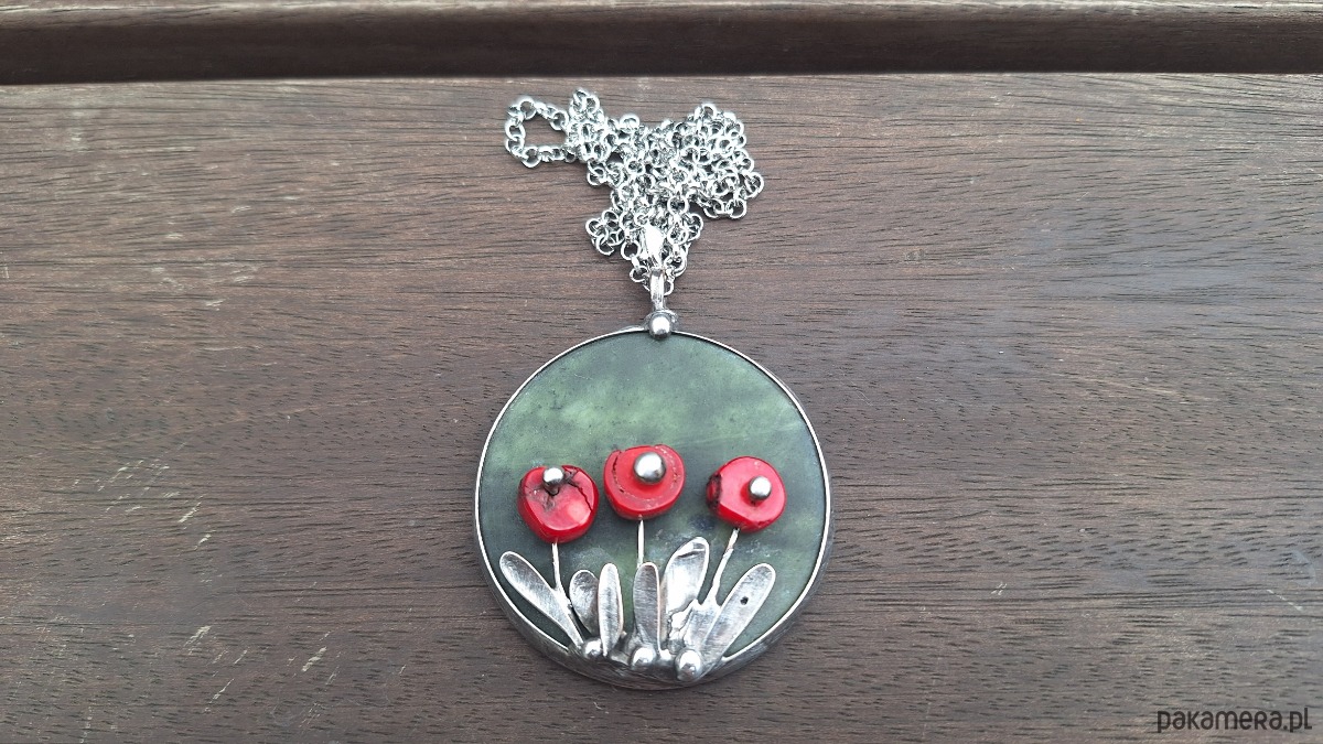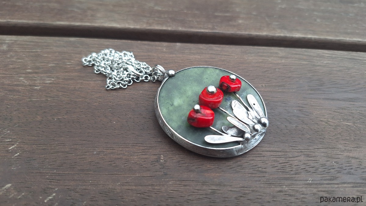 Wisiorek wykonany z miedzi, cyny, koralowców i jadeitu. Wymiary ok. 5 na 5 cm. Zawieszony na łańcuszku o długości ok. 50 cm.