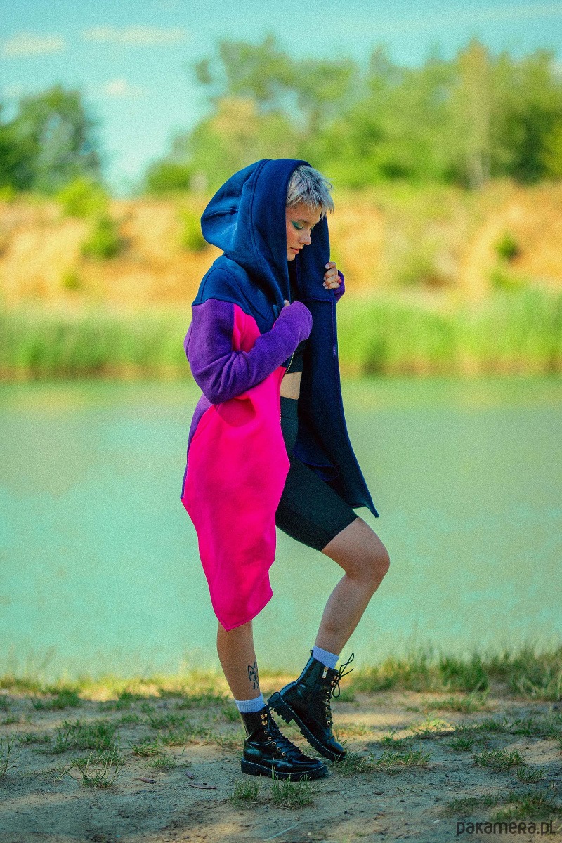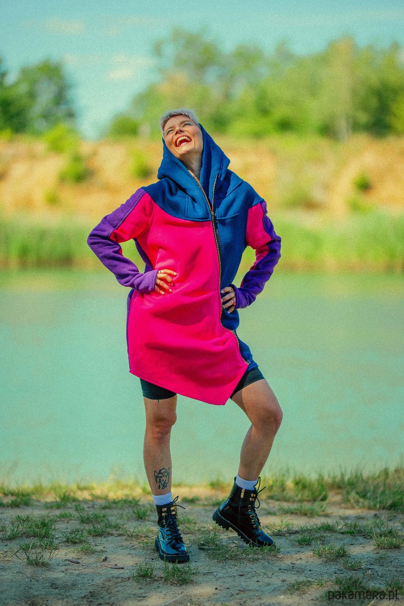 Piękna, wymyślna i bardzo ciepła bluza dresowa, wykonana z wysokiej jakości dzianiny bawełnianej. Posiada kaptur i dwie kieszenie ,rękawy długie zakończone otworem na kciuk. Najnowszy, nietypowy fason!