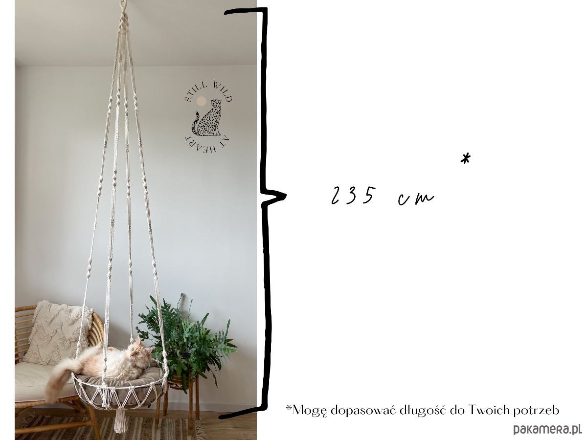 • Hamak stworzony jest miękkiego sznurka bawełnianego pochodzącego z recyklingu oraz metalowej obręczy (białej, srebrnej lub czarnej)