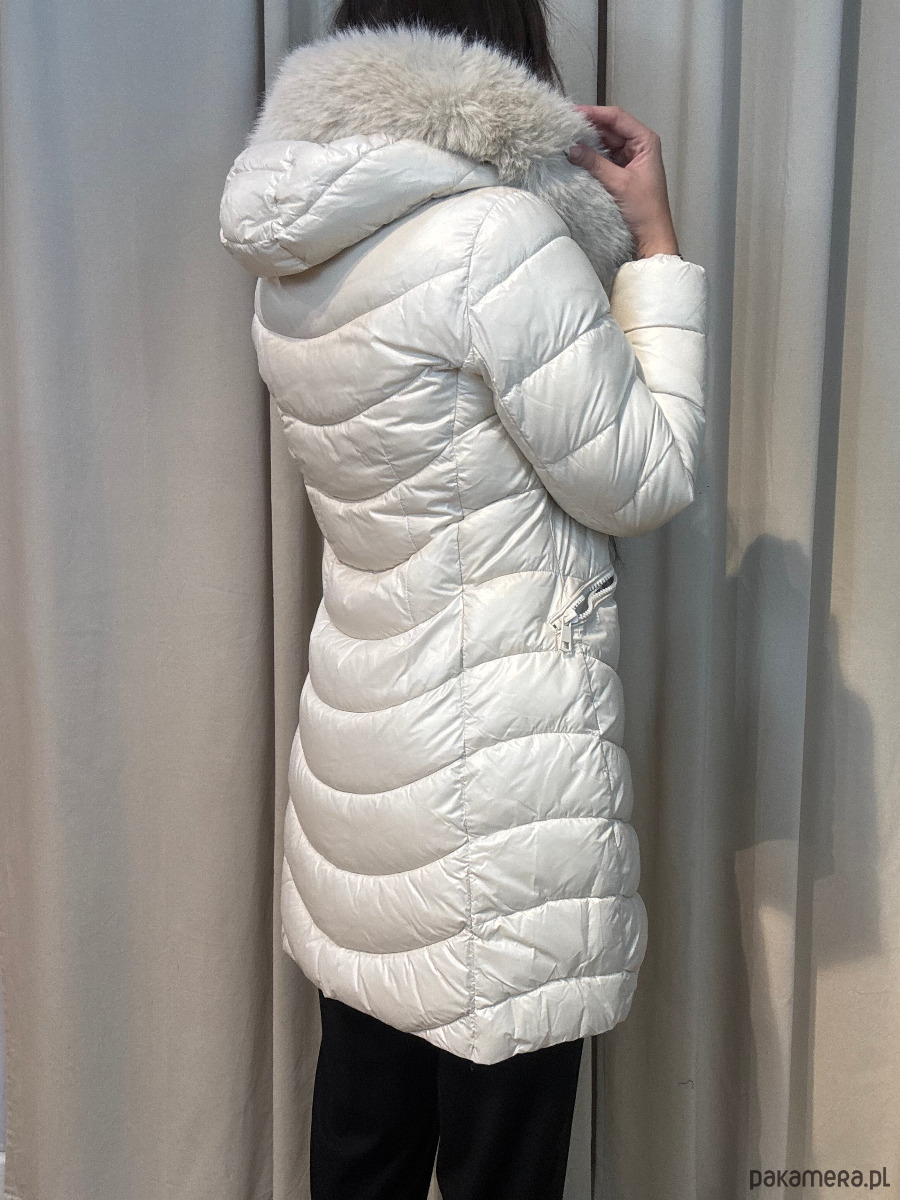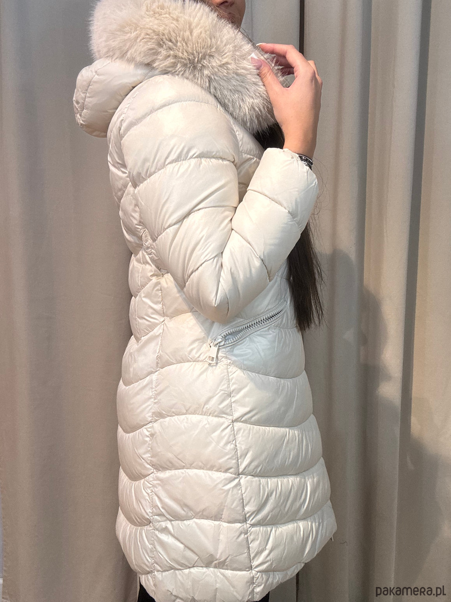 Długa, kurtka zimowa z futerkiem przy kapturze.